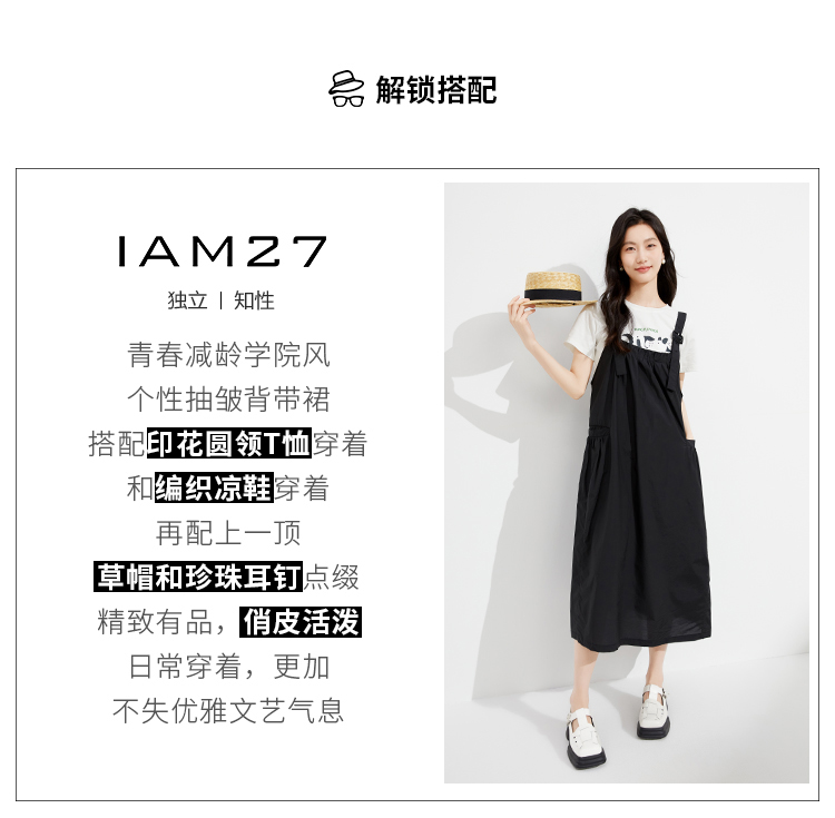 IAmMIX27黑色背帶裙女中長款寬松日系工裝風休閑百搭無袖連衣裙子