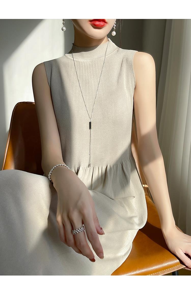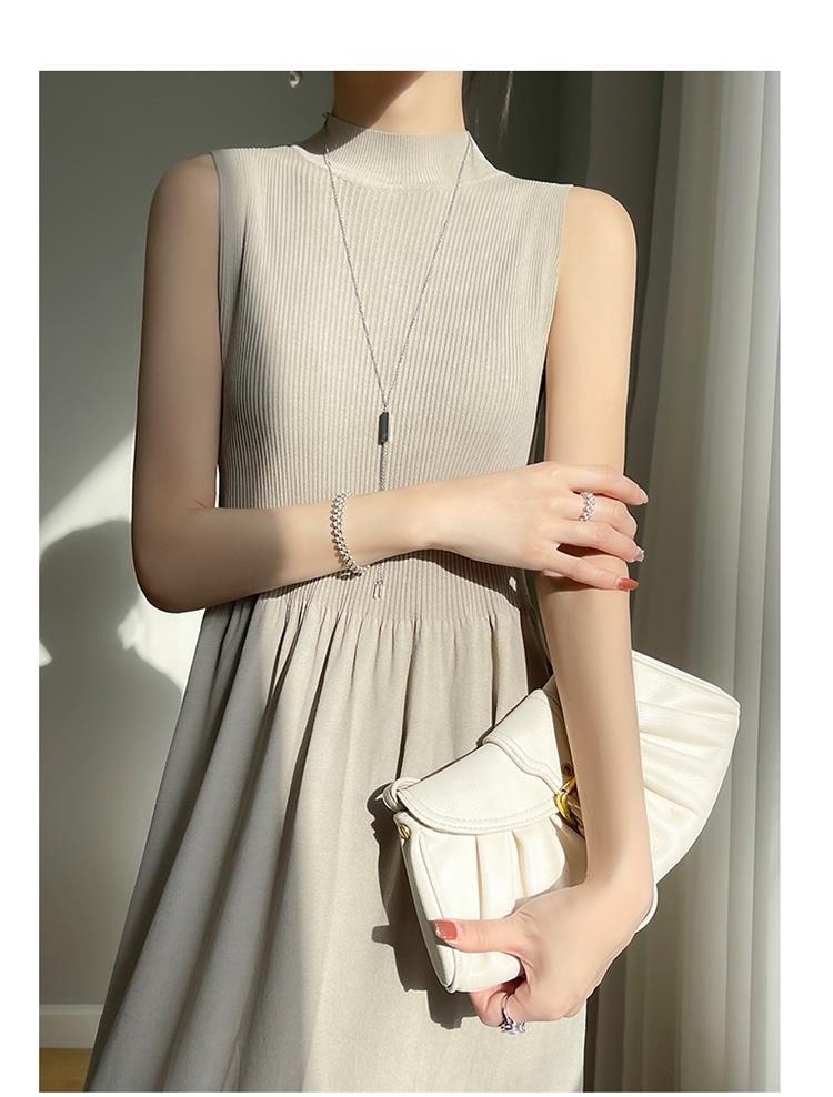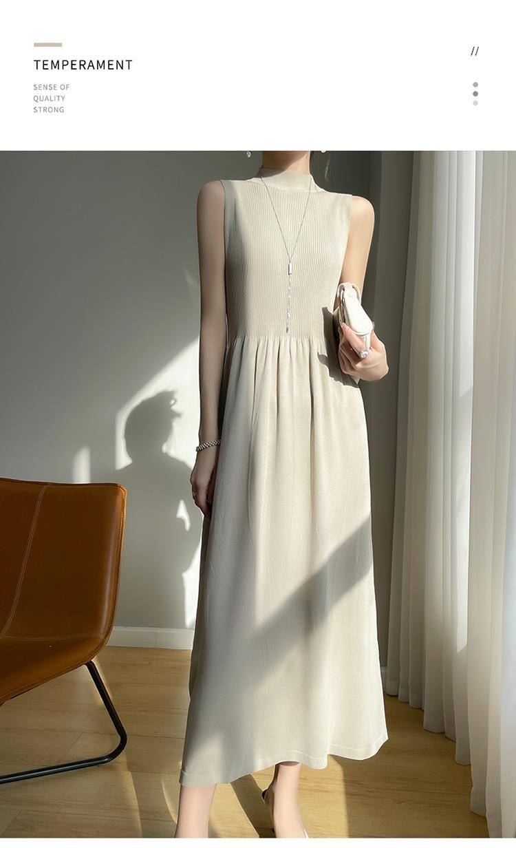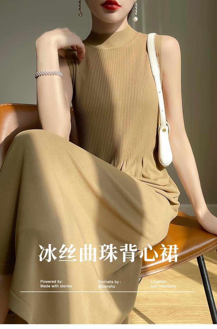 曲珠冰絲半高領無袖背心連衣裙女夏修身顯瘦中長款針織裙內搭長裙
