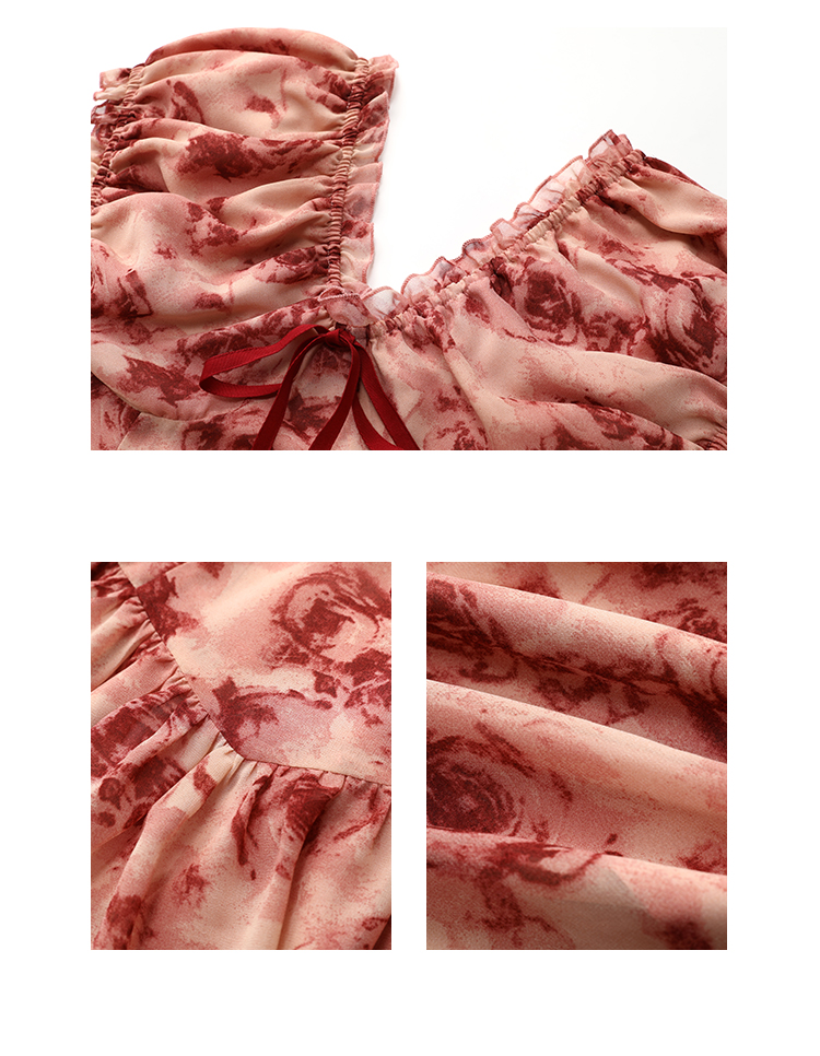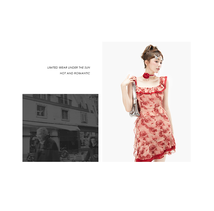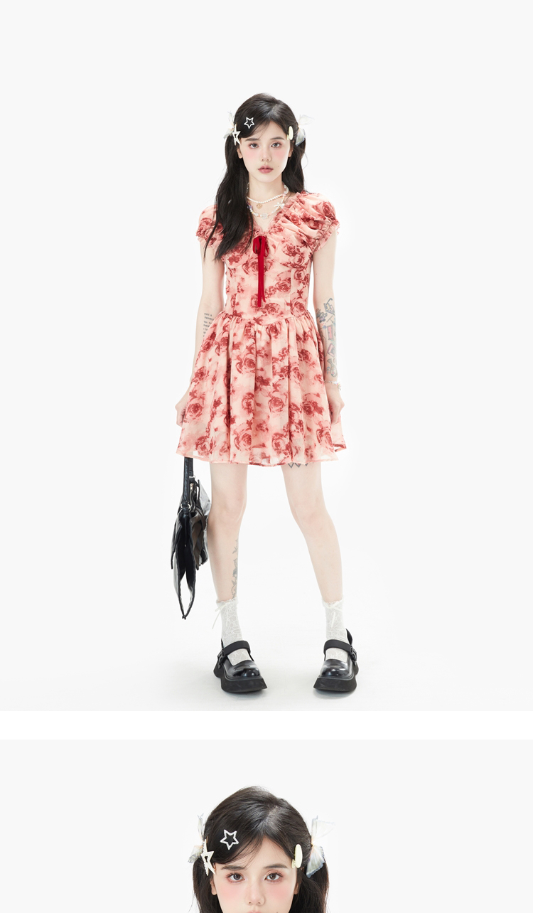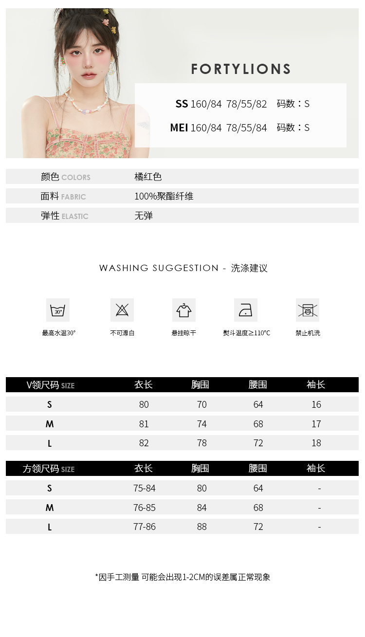 fortylions四十只獅 法式連衣裙純欲V領碎花裙辣妹收腰顯瘦玫瑰裙