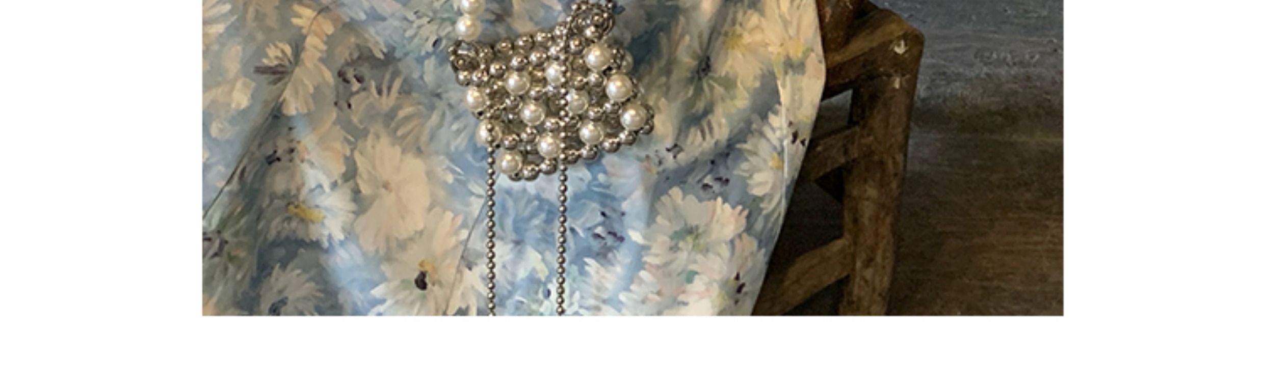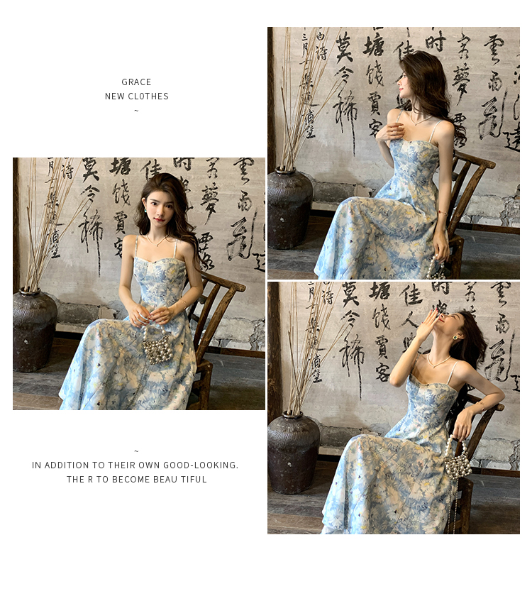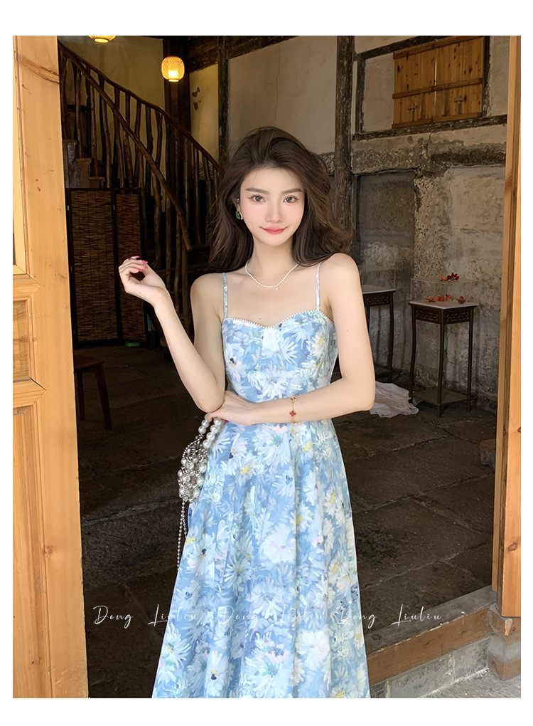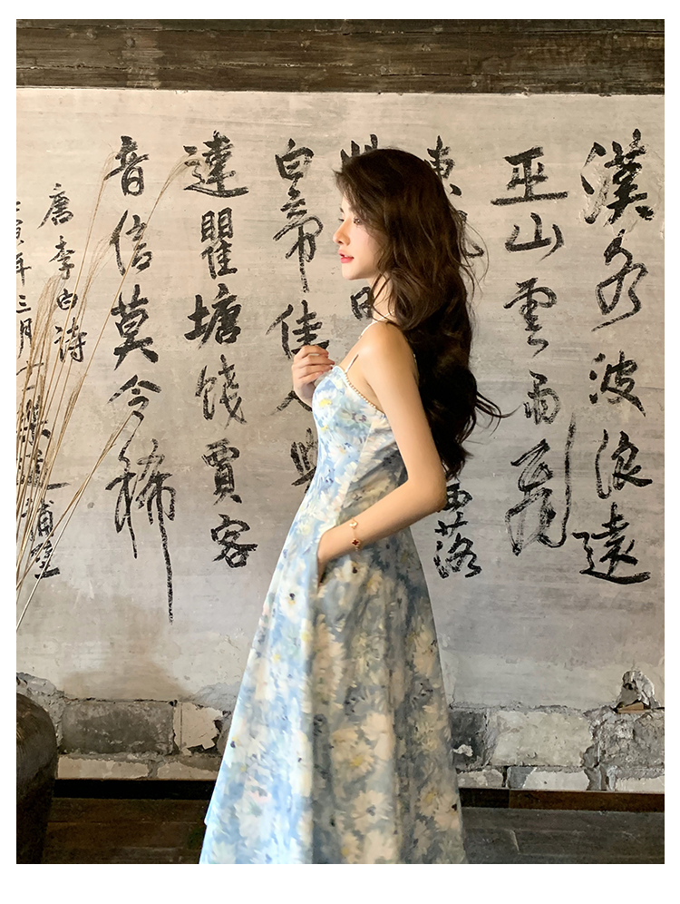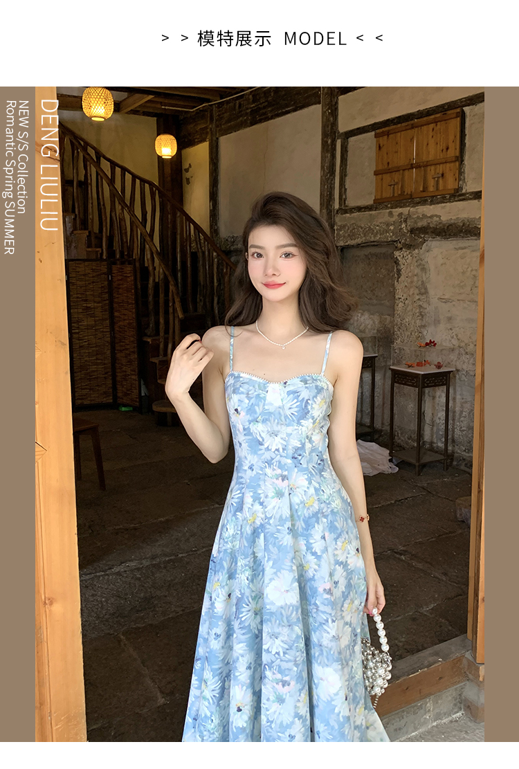 鄧六六藍色油畫法式碎花吊帶連衣裙女夏季輕熟風質感高級修身長裙