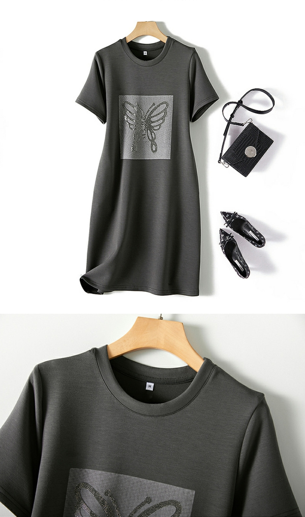 東歐燙鉆印花大碼連衣裙女夏季新款中長裙2023年歐洲站休閑t恤裙
