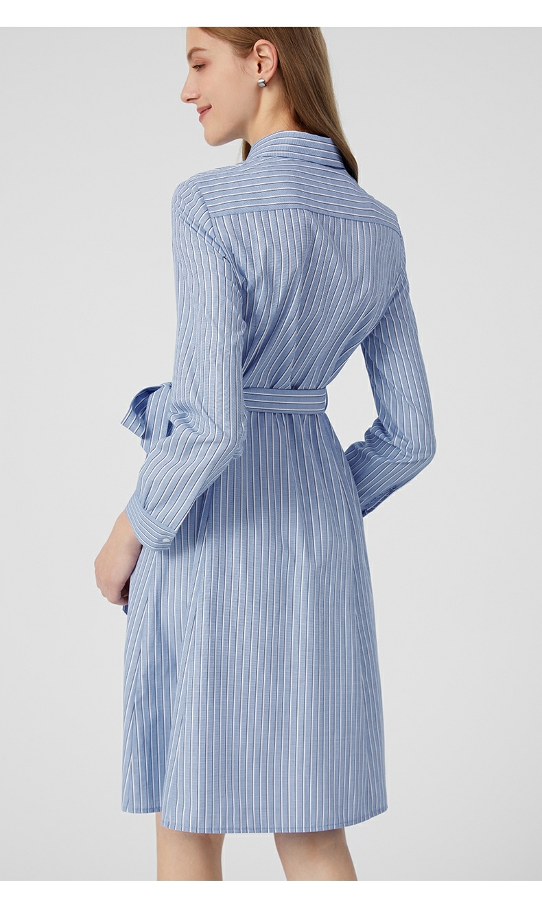 Hush Puppies暇步士女裝2023秋季藍白條紋拼接系帶長袖襯衫連衣裙