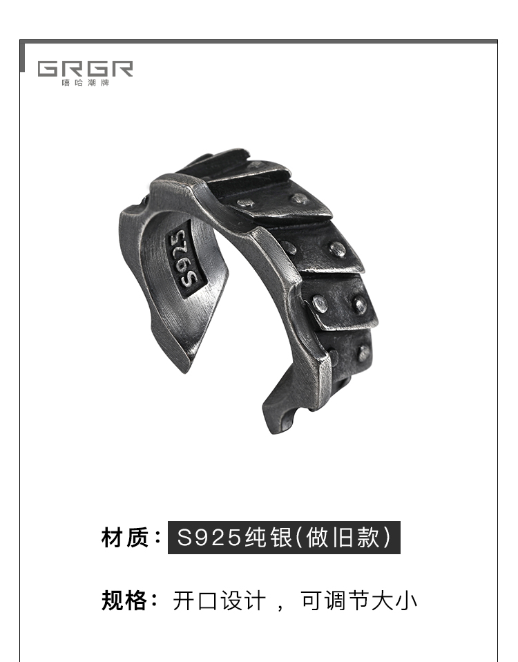 GRGRS925純銀盔甲做舊戒指男士嘻哈復古潮流開口可調高級感食指戒
