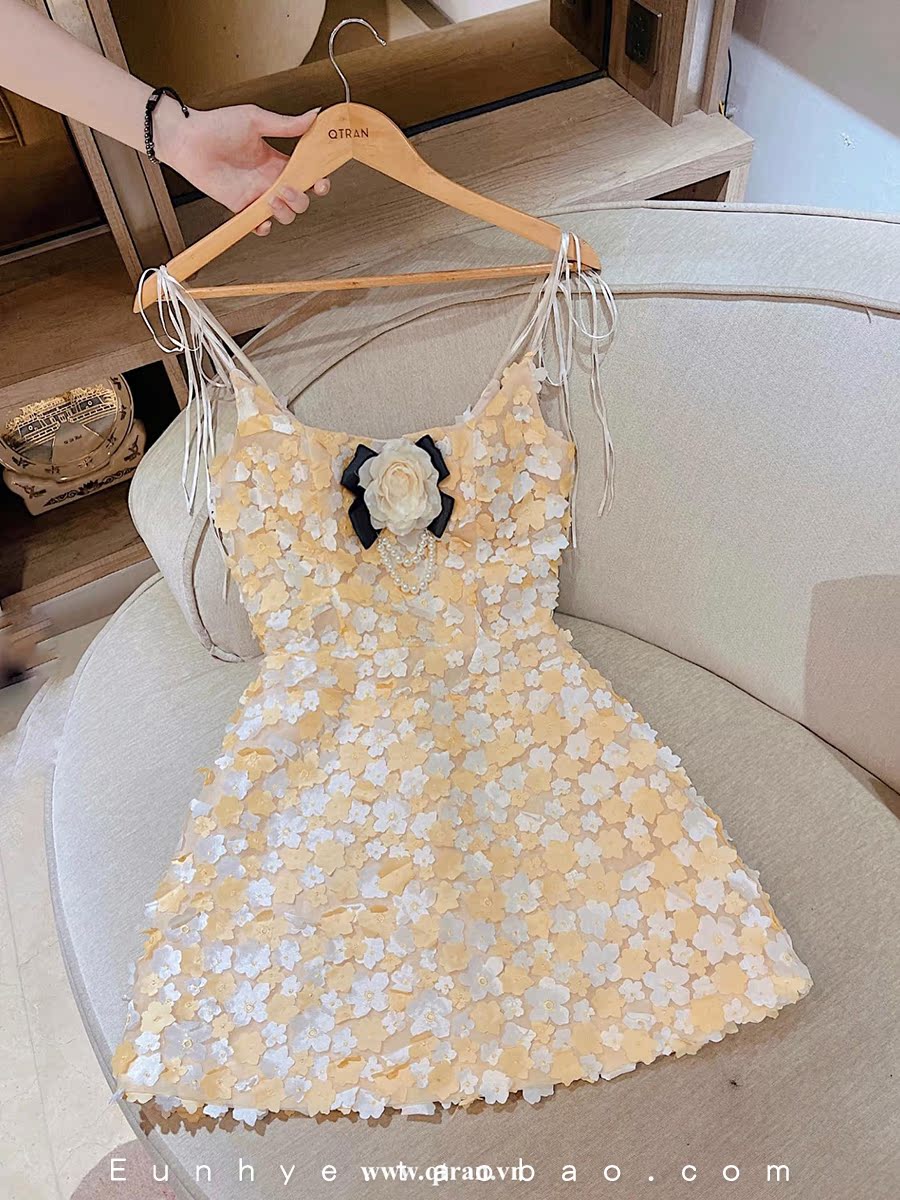 越南小眾QTRAN 2023年夏季新款繁花盛開淡黃白配色仙女吊帶裙