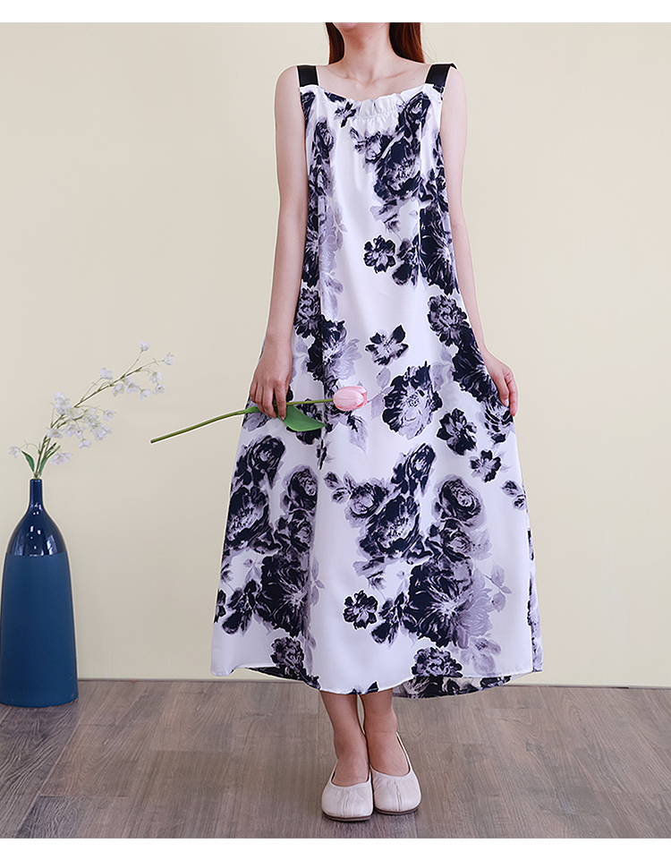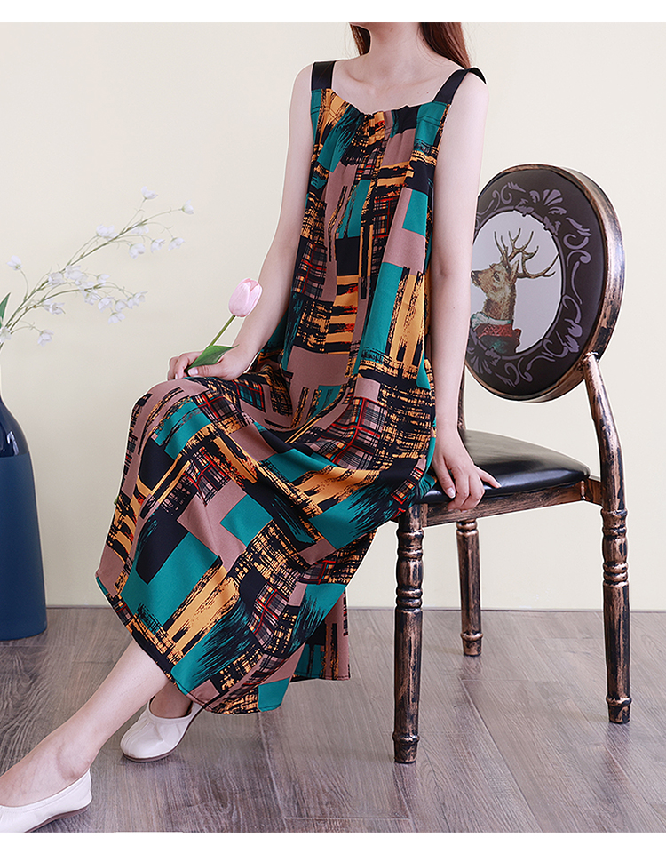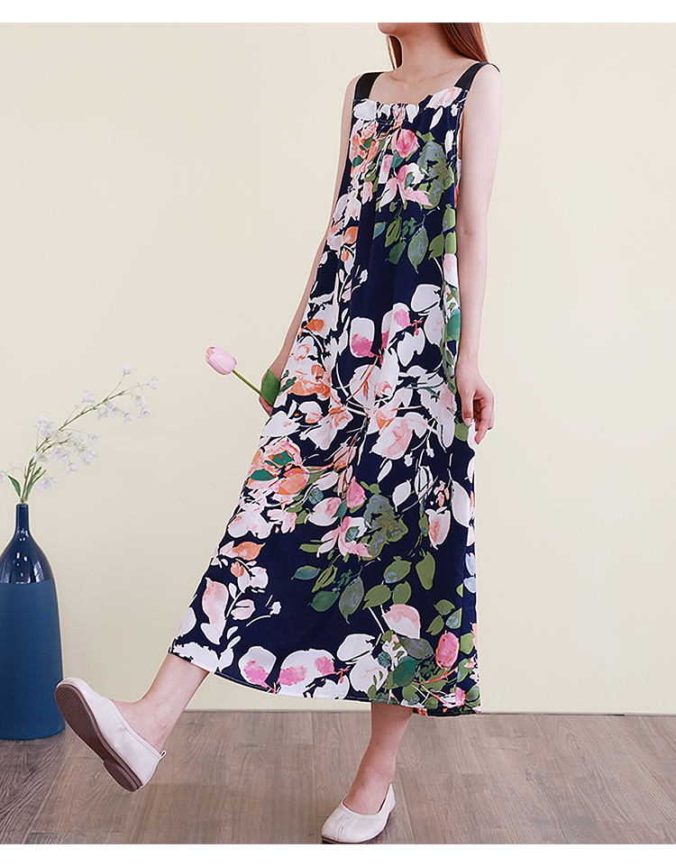 復古文藝范印花真絲吊帶連衣裙夏季長款過膝氣質長裙子寬松森女系