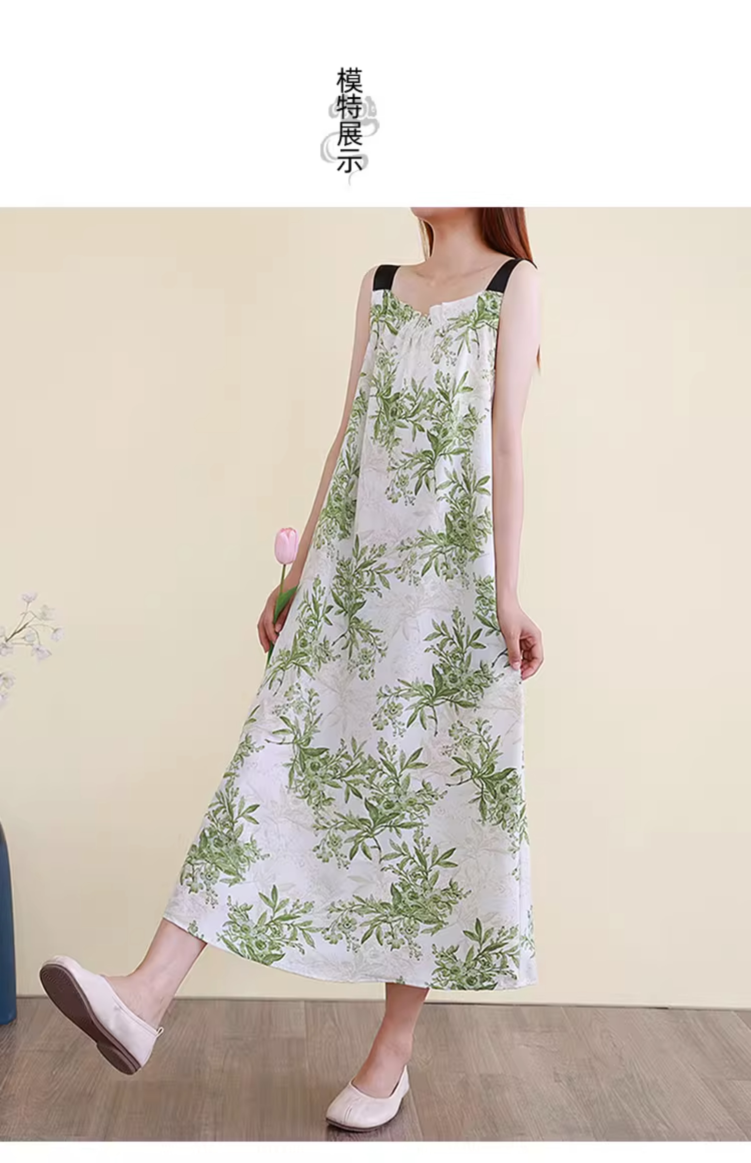 天絲麻印花無袖連衣裙女夏季長款改良旗袍裙子腰系盤扣民族風顯瘦