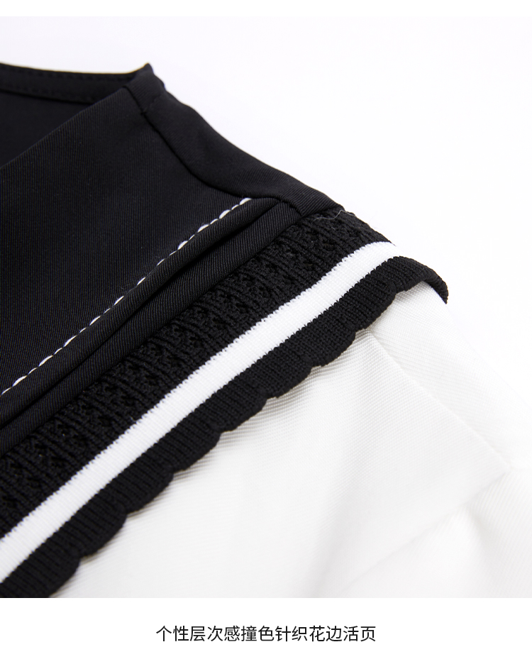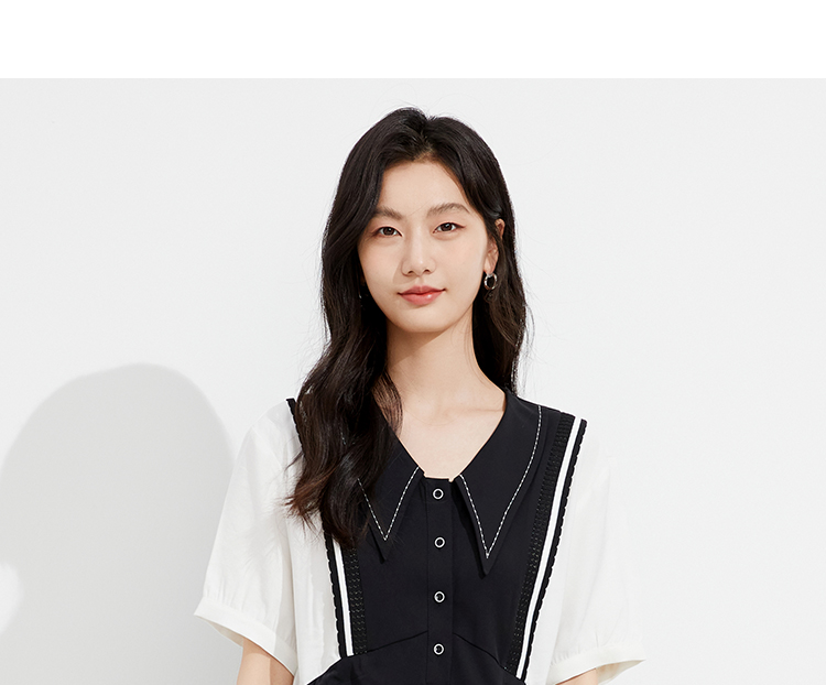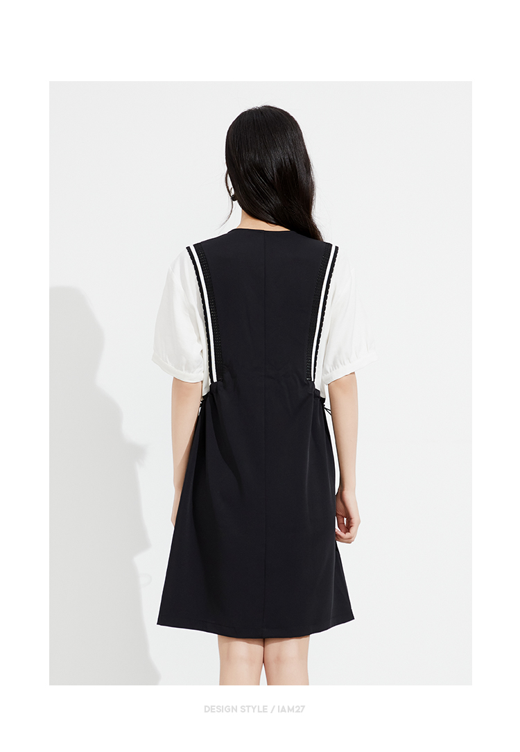 IAmMIX27夏季翻領連衣裙女短袖高腰顯瘦黑白撞色休閑通勤中長裙子