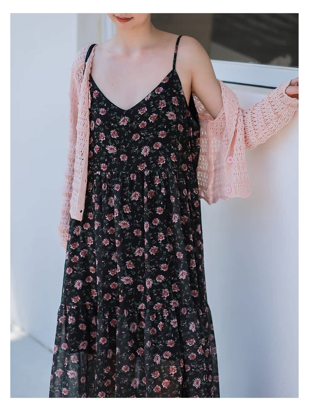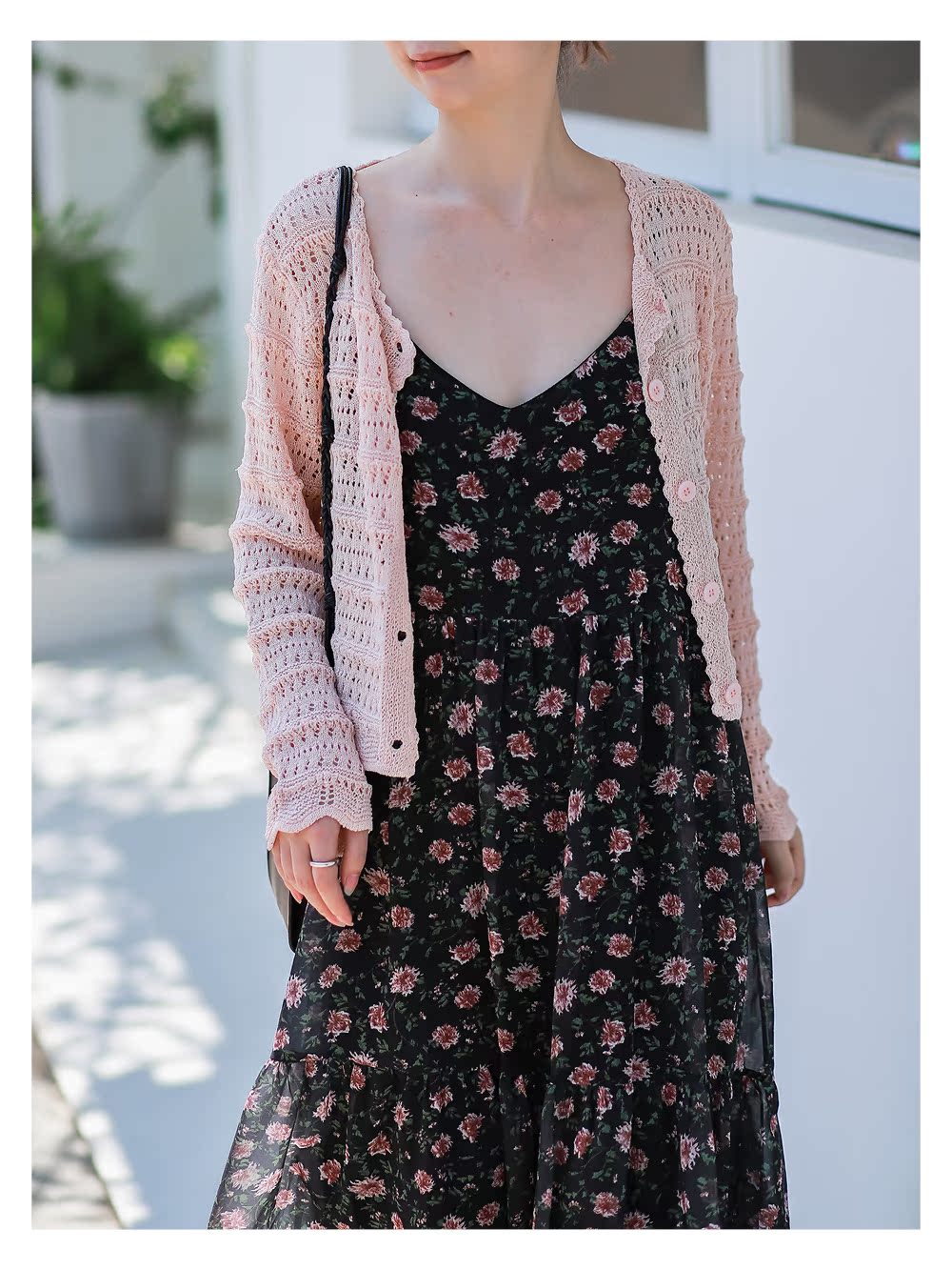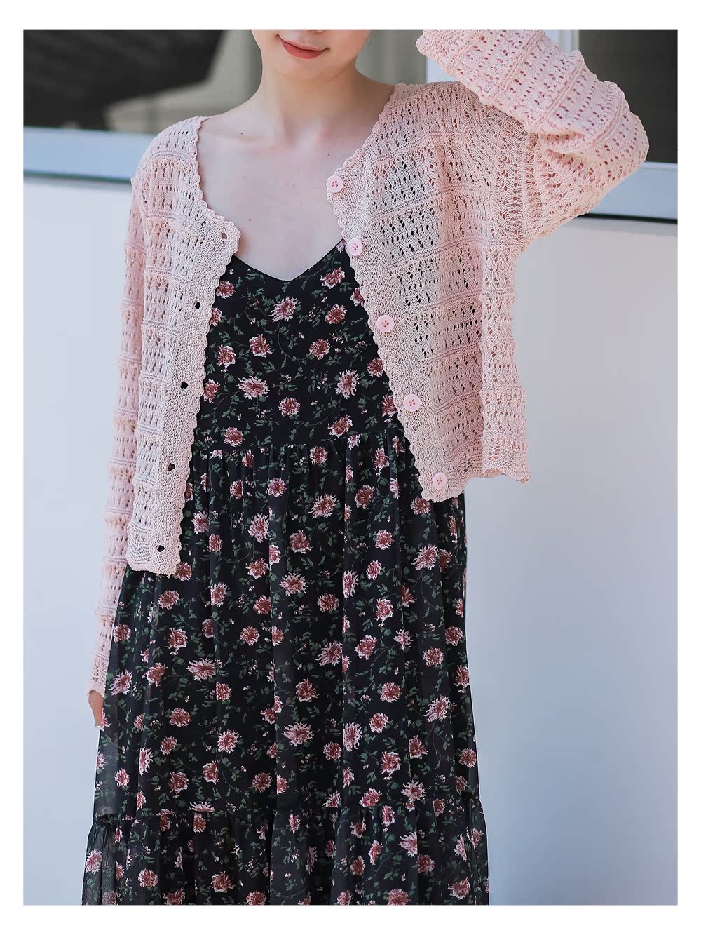 菲爾丹 復古風吊帶花色連衣裙 淺粉鉤花長袖防曬防走光空調衫6801