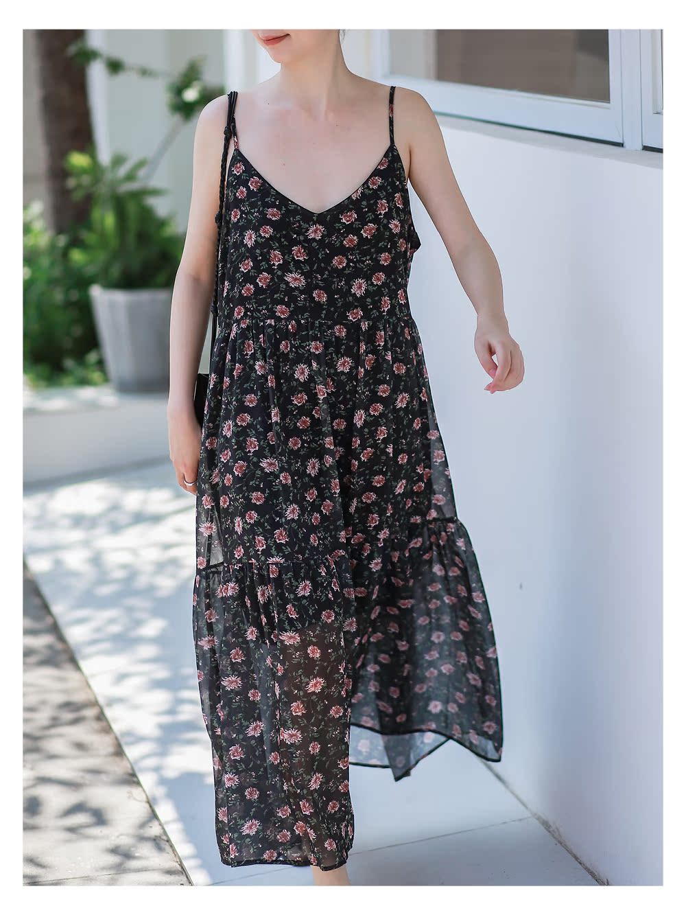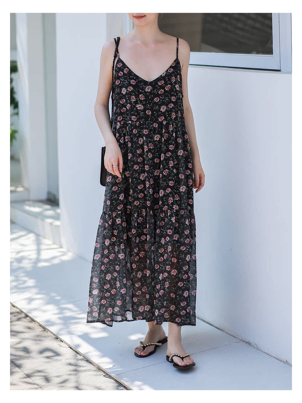 蕾絲碎花吊帶連衣裙長裙女黑色2023夏度假風