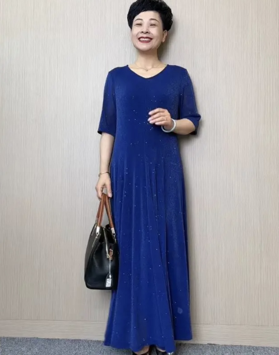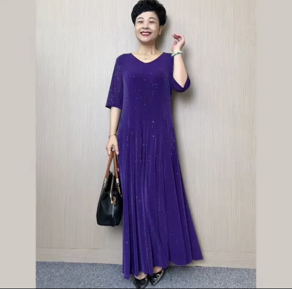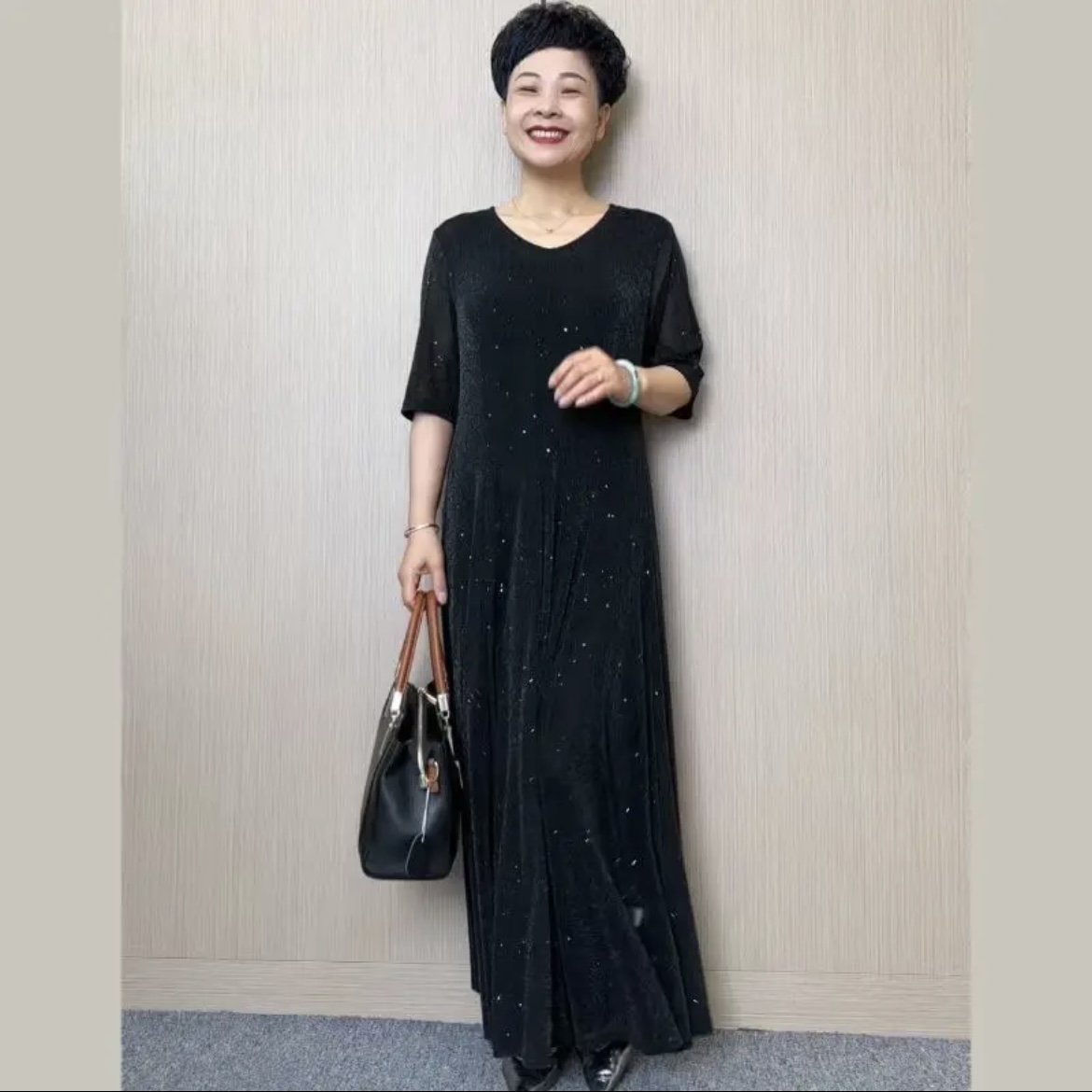 高端夏季短袖長款彈力大碼時尚減齡中年媽媽純色星空大擺連衣裙子