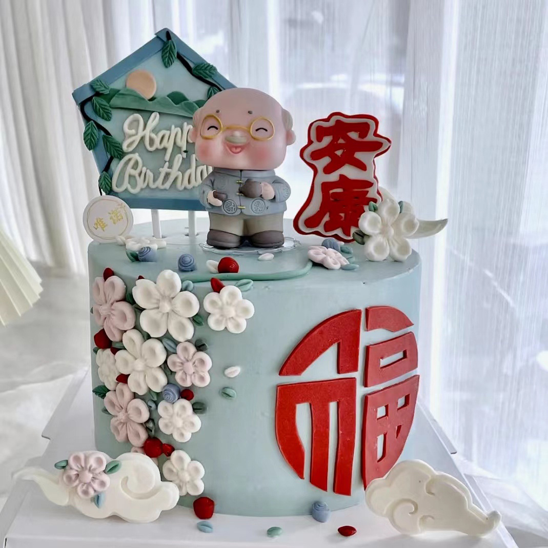 仿翻糖福安康祥云祝壽蛋糕裝飾插件爺爺奶奶壽星公婆擺件巧克力