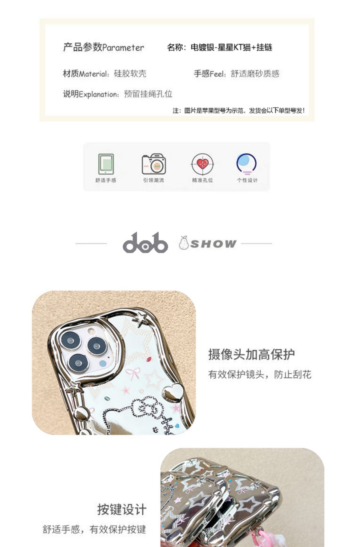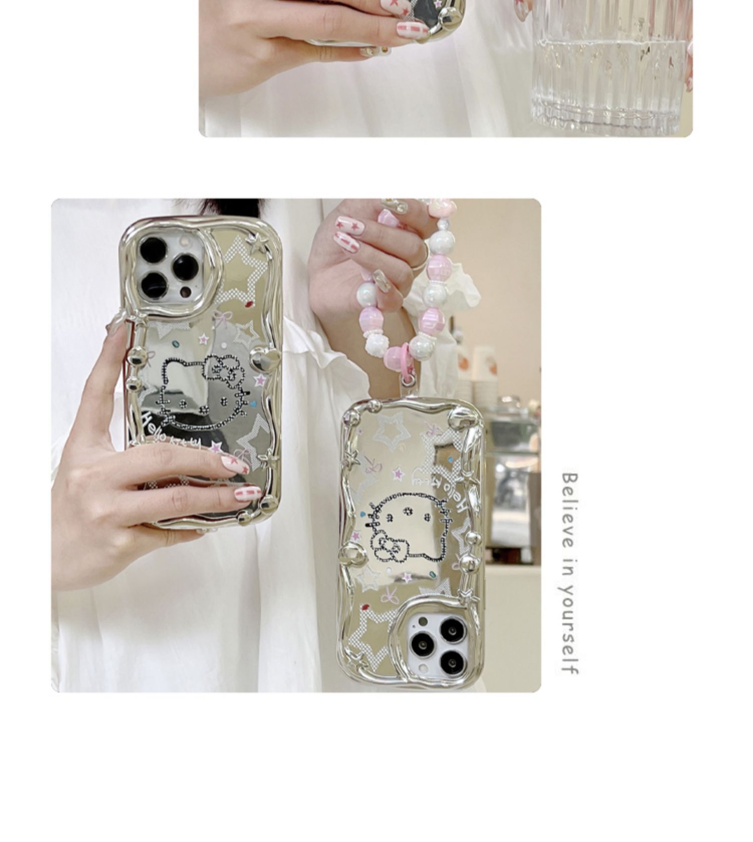 適用iPhone14promax手機殼鏡面kt貓星星電鍍銀色蘋果15新款14pro女12小眾ins甜酷辣妹鏡子鏈條11防摔保護套13