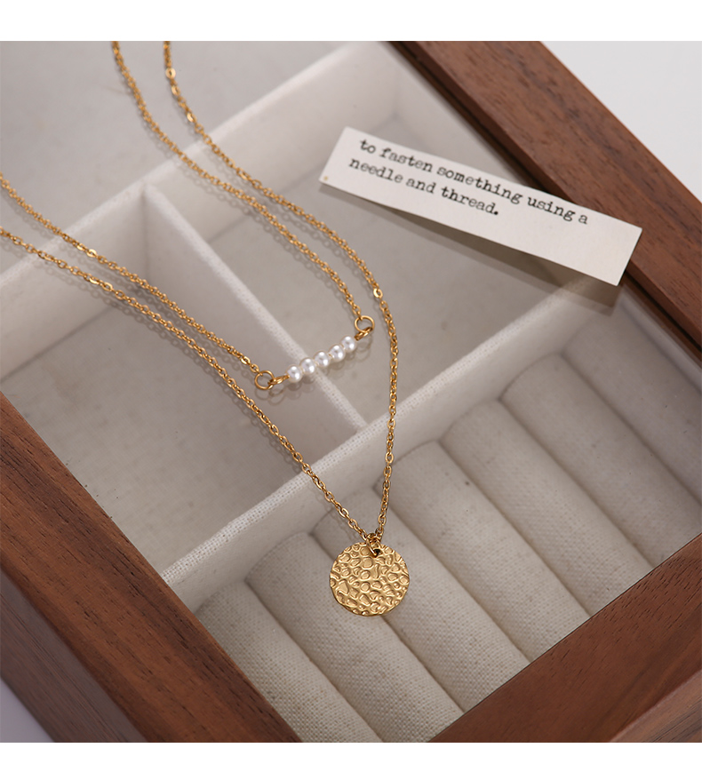 歐美簡約雙層疊戴珍珠圓牌項鏈女小眾設計感鈦鋼鎖骨鏈時尚配飾品