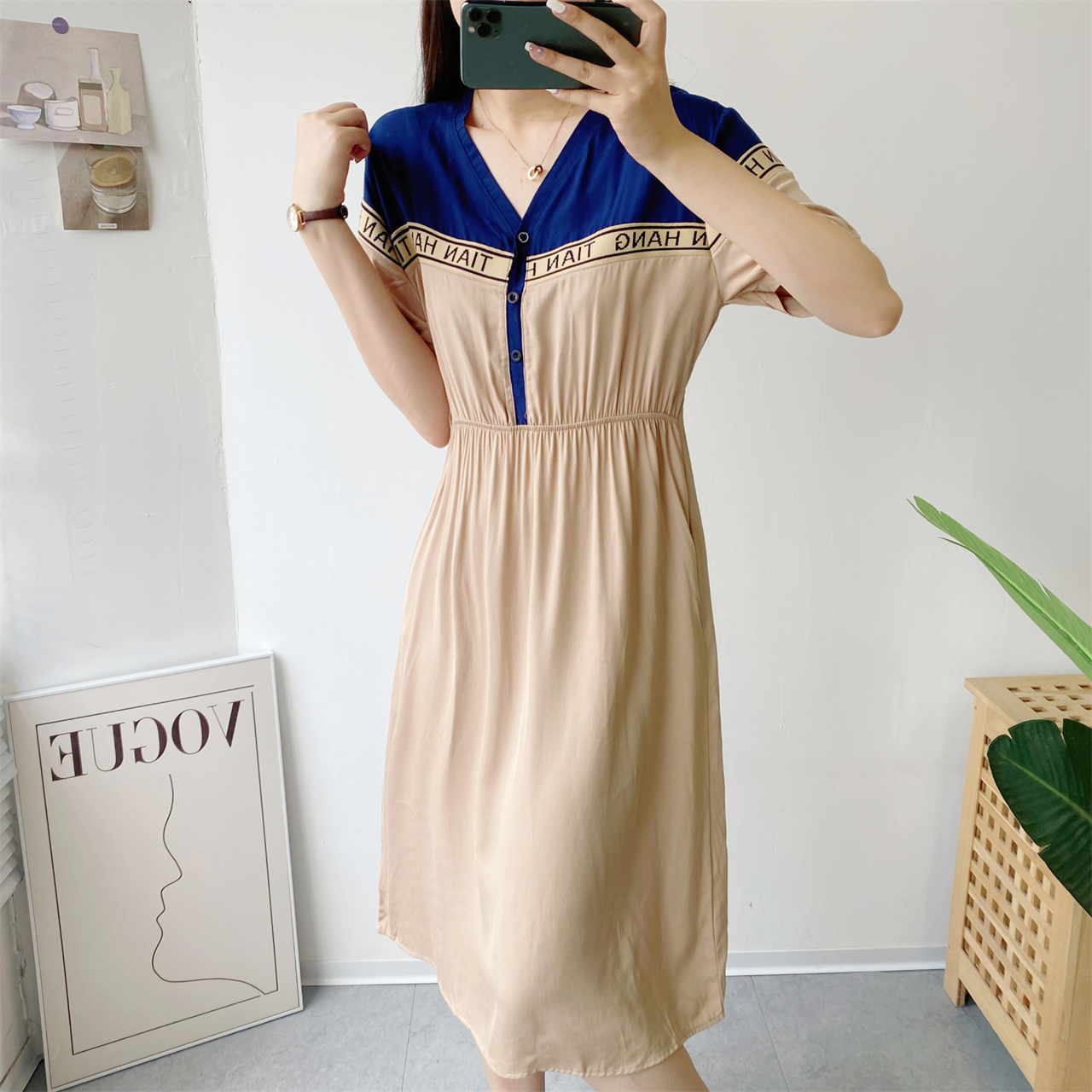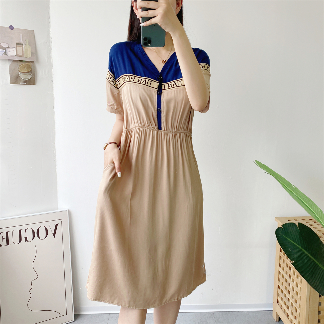 v領短袖夏季抽繩收腰拼接連衣裙