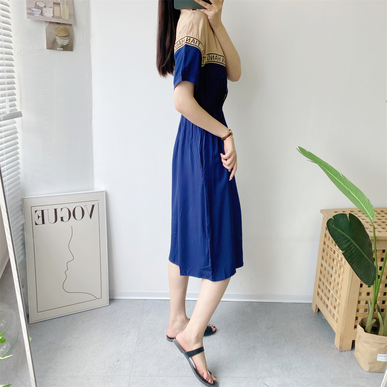 棉綢連衣裙女2023年夏季短袖收腰顯瘦拼接純色人造棉沙灘裙大擺裙