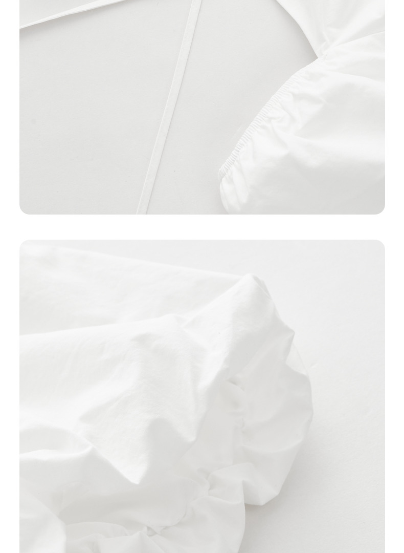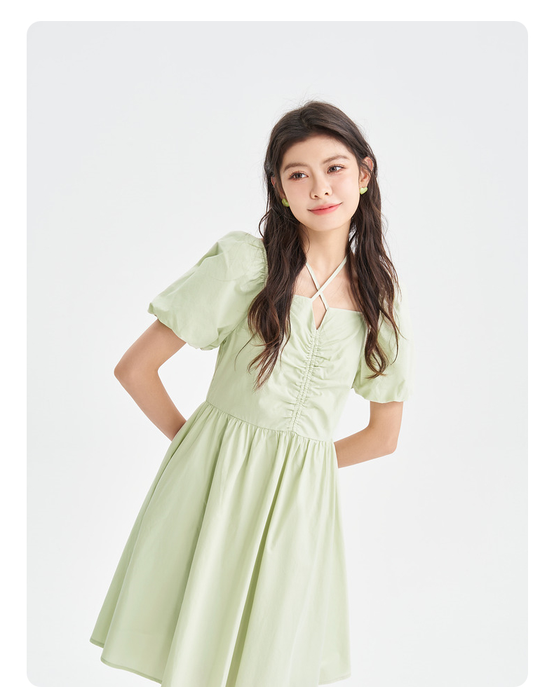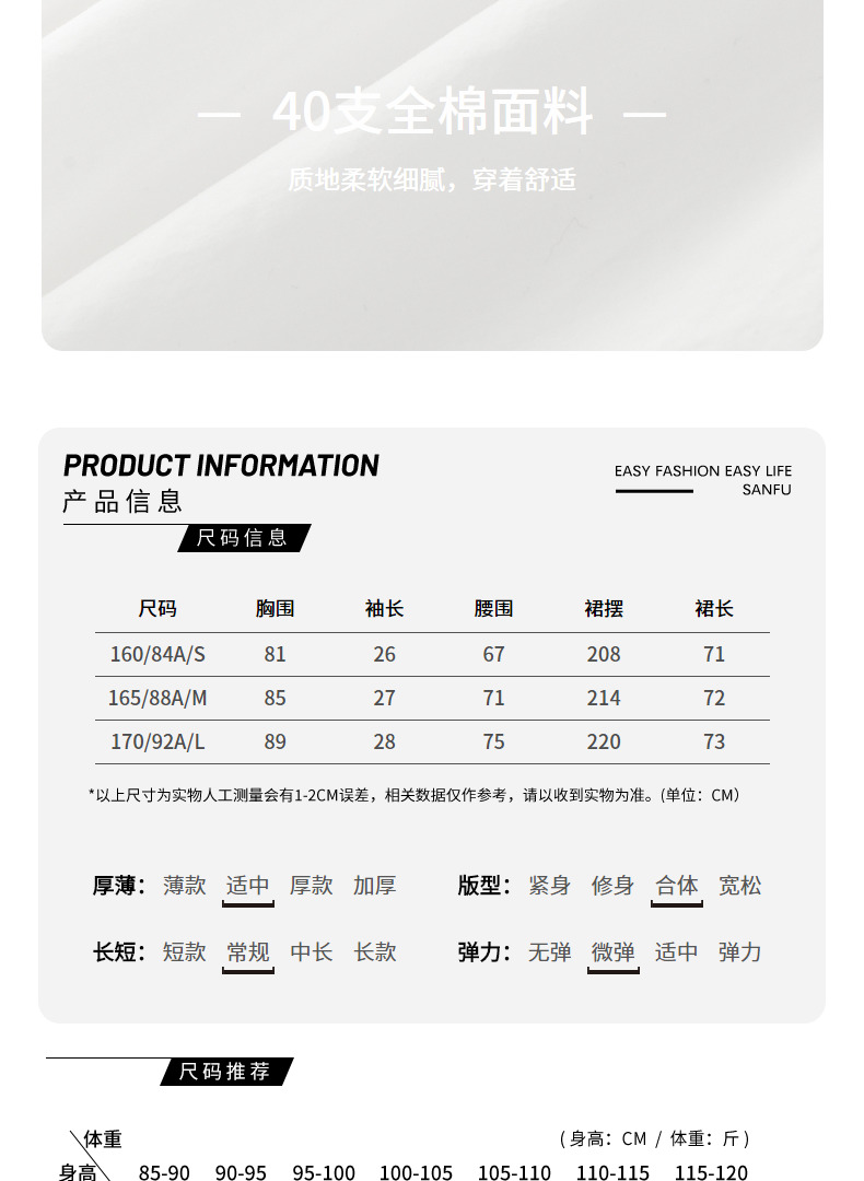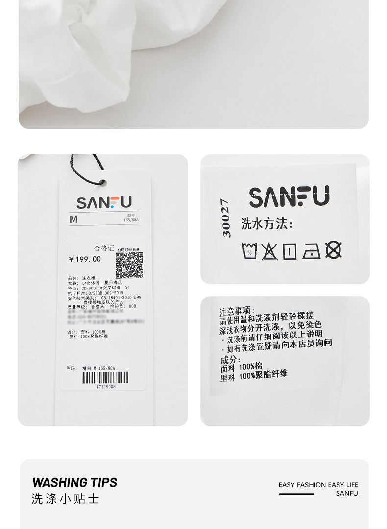 三福白色連衣裙2023新款女夏季方領泡泡袖抽褶綁繩a字裙子471299