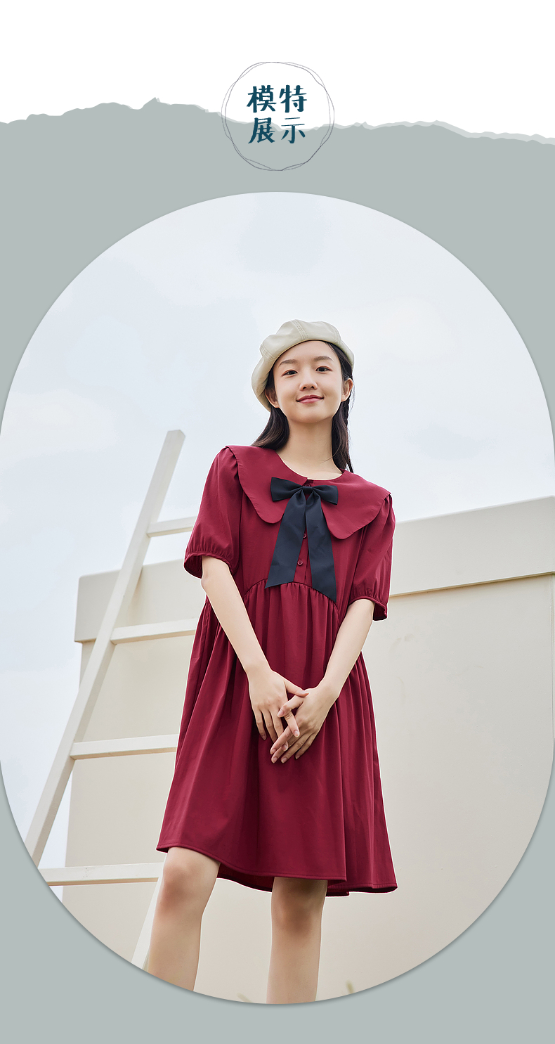 紫涵翻領撞色連衣裙2023夏季新款蝴蝶結A字連衣裙小個子裙子甜美