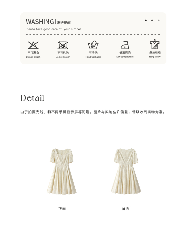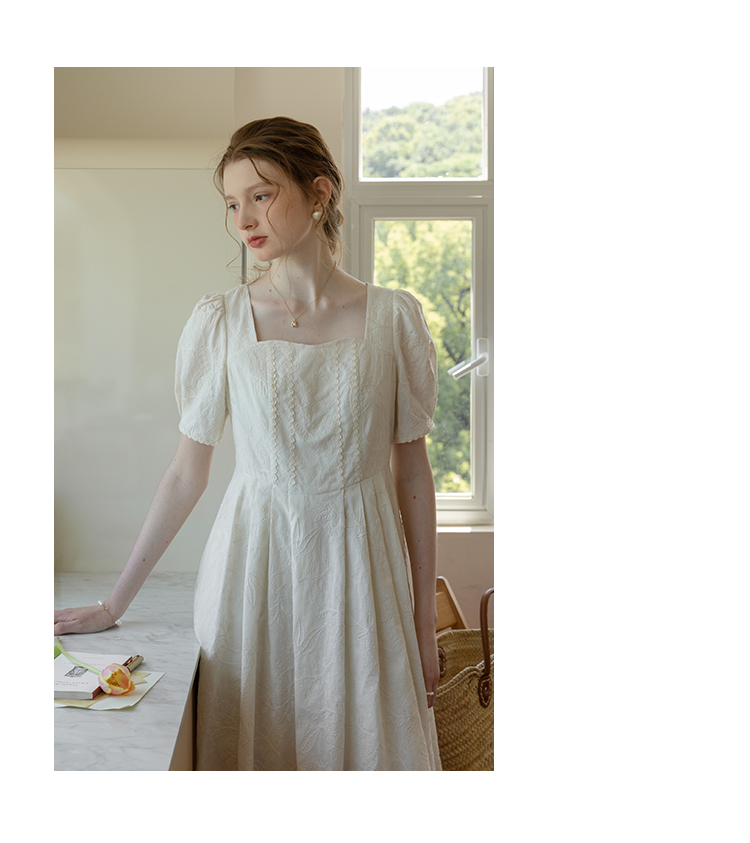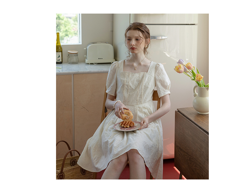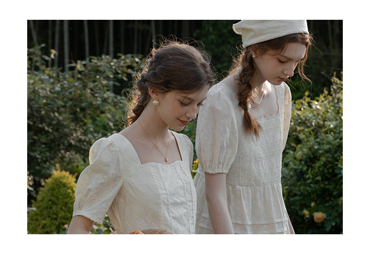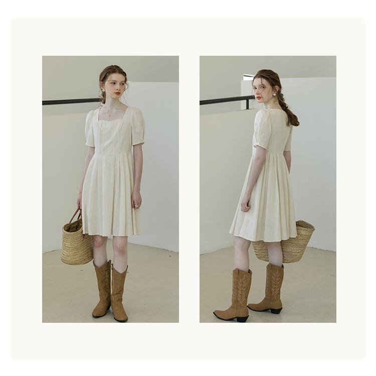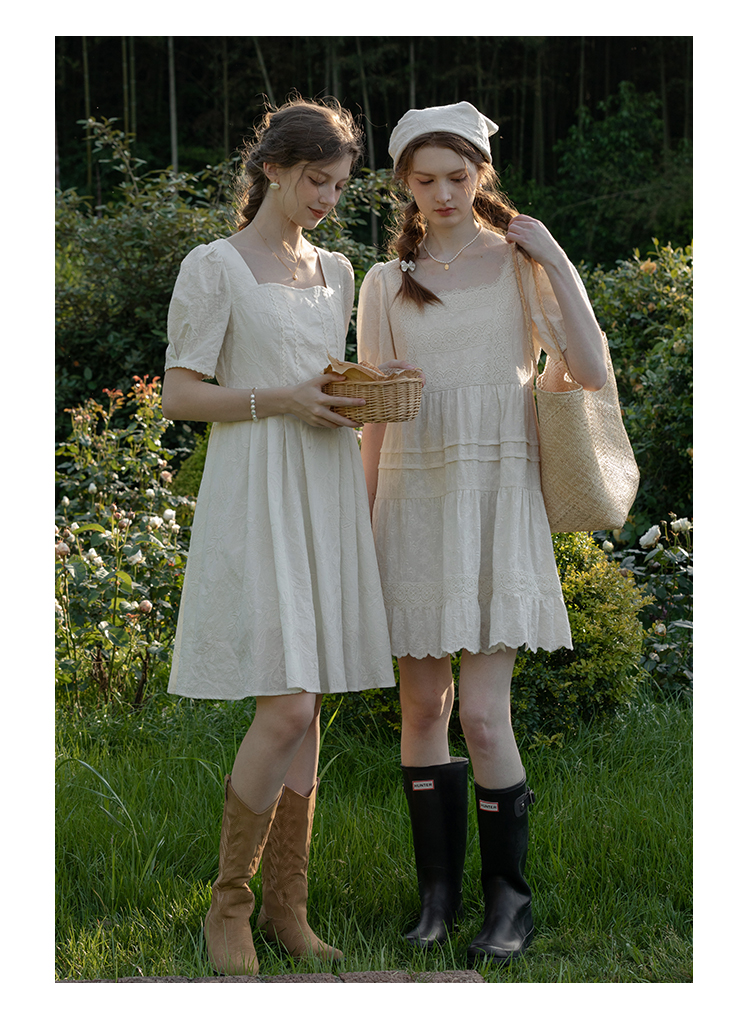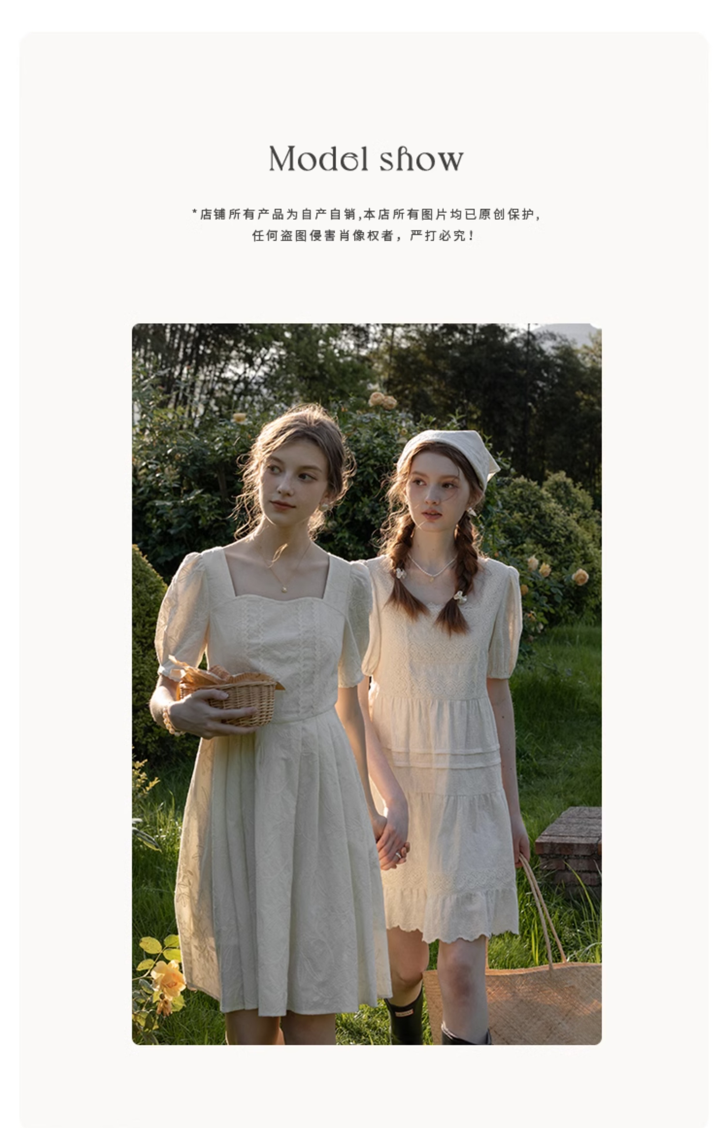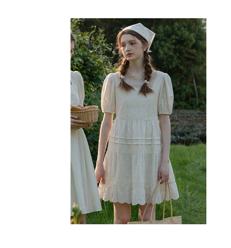 MELLIIY 2023新款復古方領重工刺繡米白色法式純棉百褶連衣裙夏女