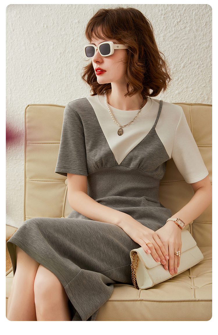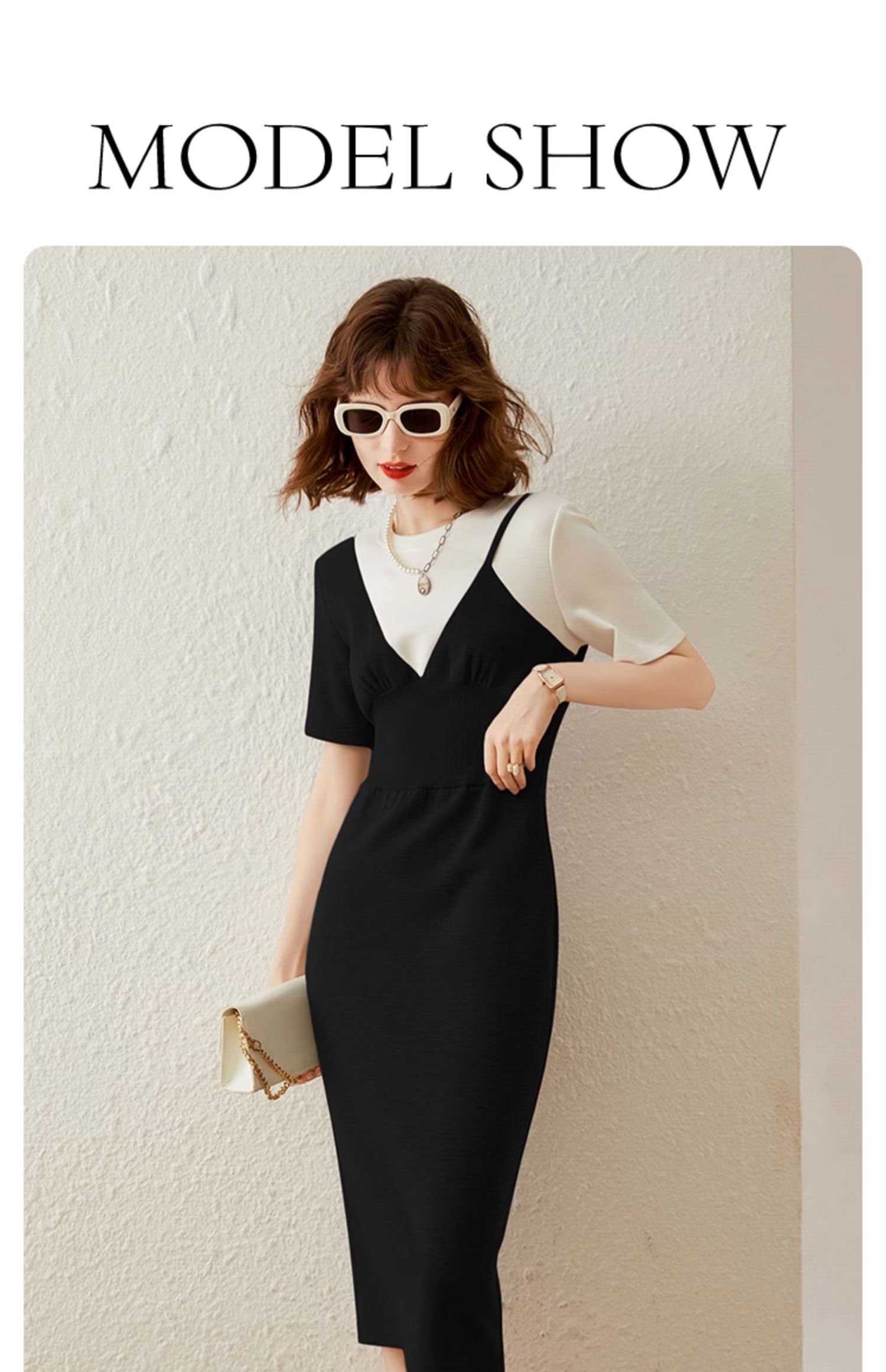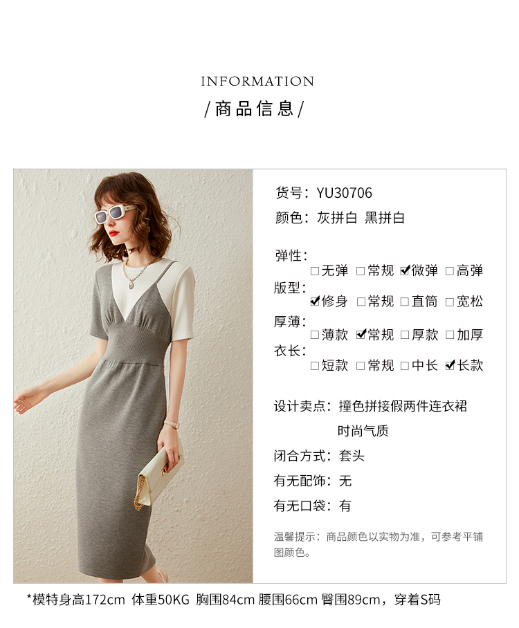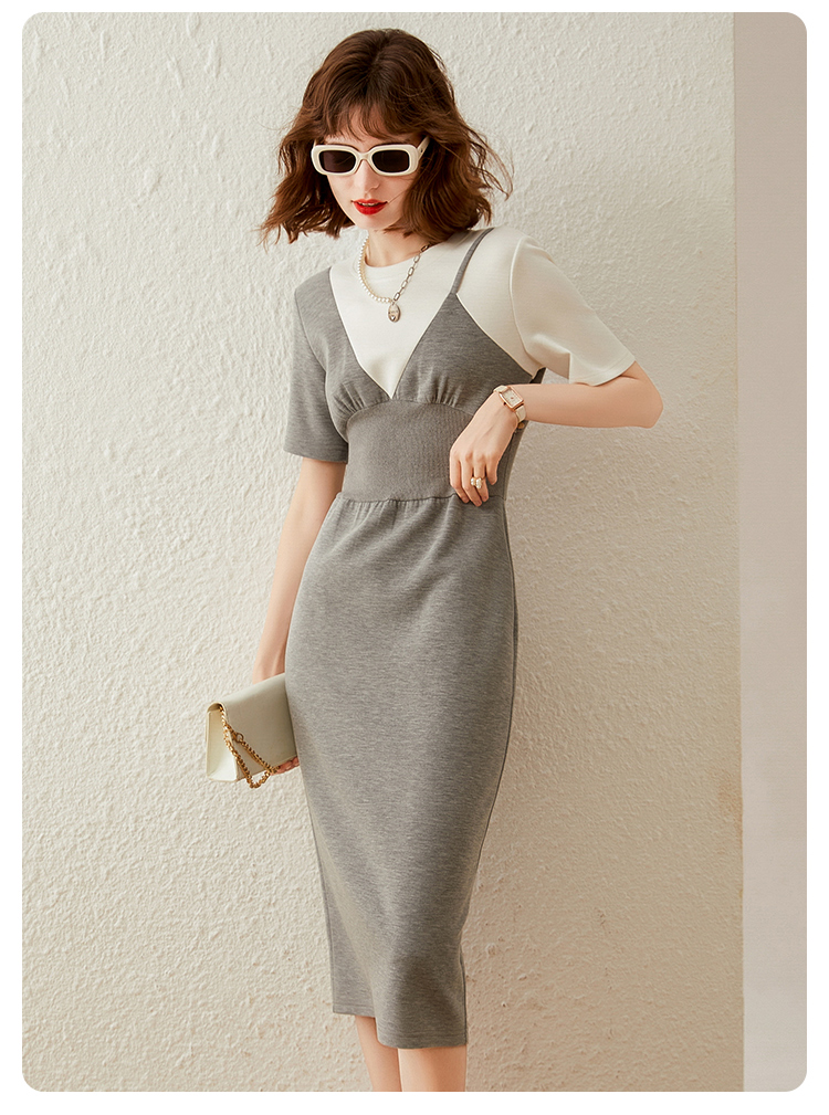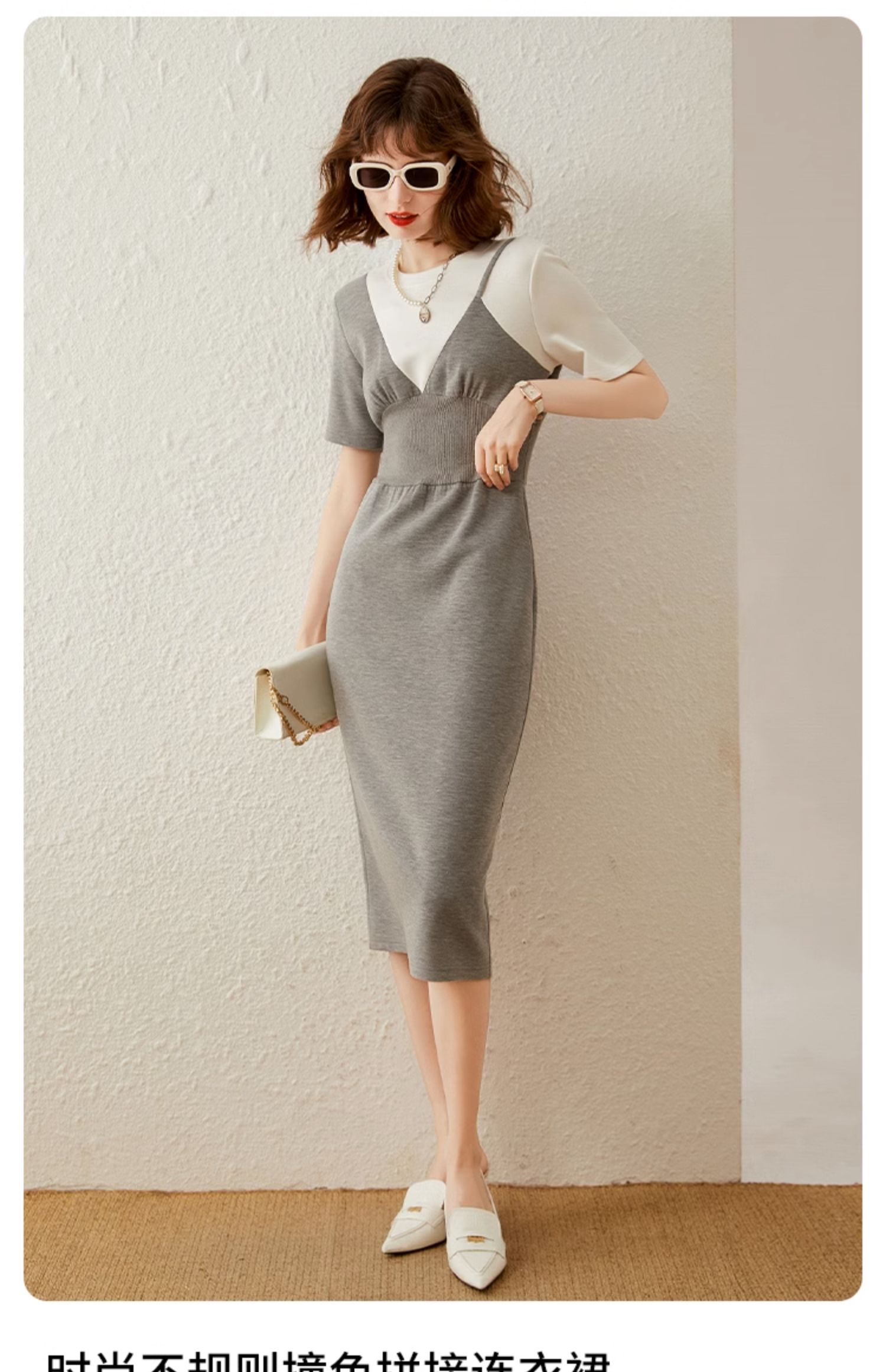 白鹿語撞色拼接假兩件長裙2023夏新款時尚優雅修身開叉休閑連衣裙