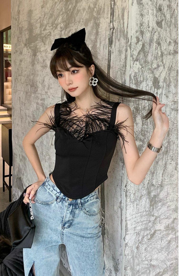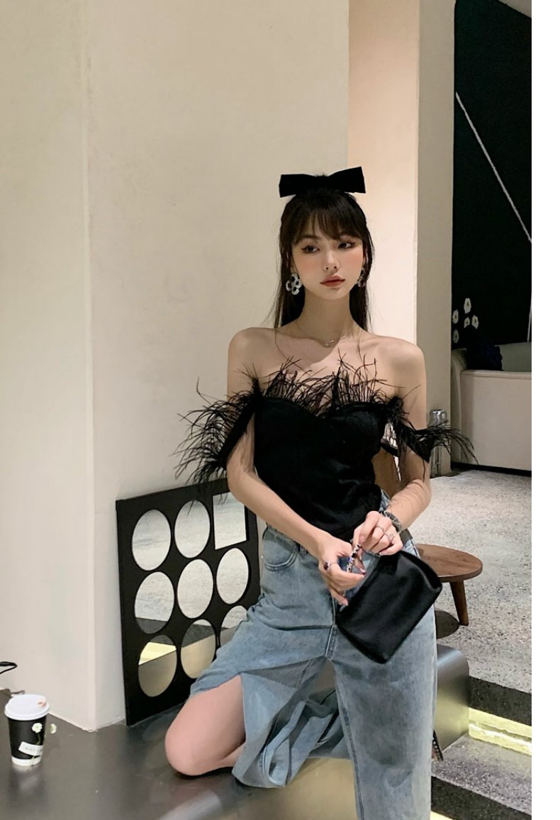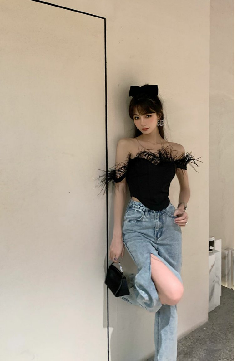 LILLIAN LORRAINE 鴕鳥毛拼接魚骨束身上衣破洞后開叉牛仔褲 木蘭