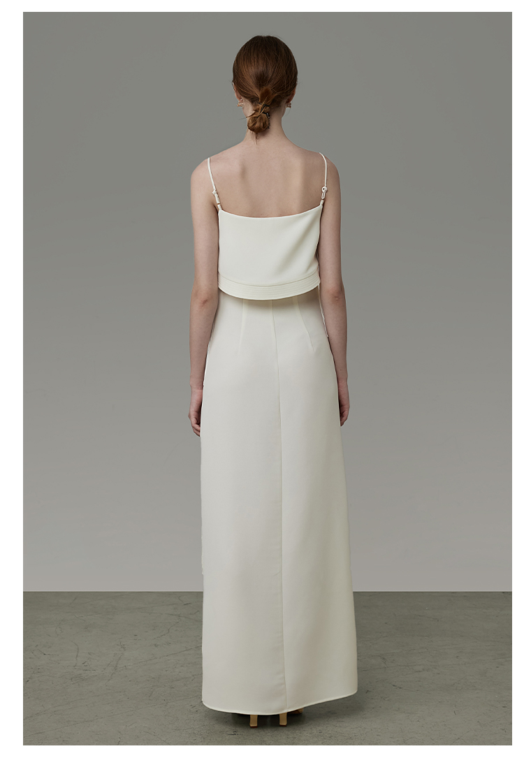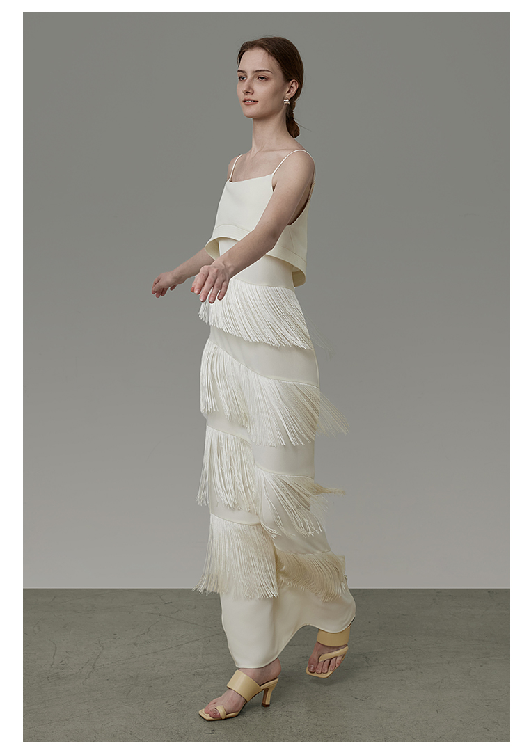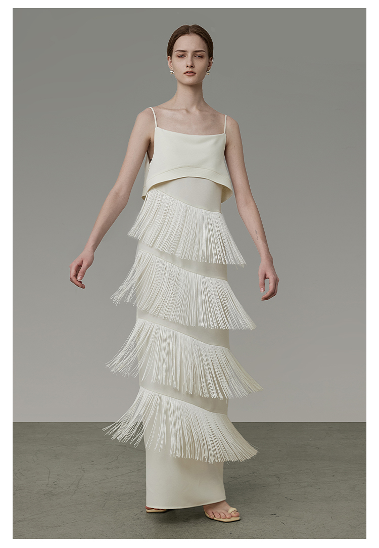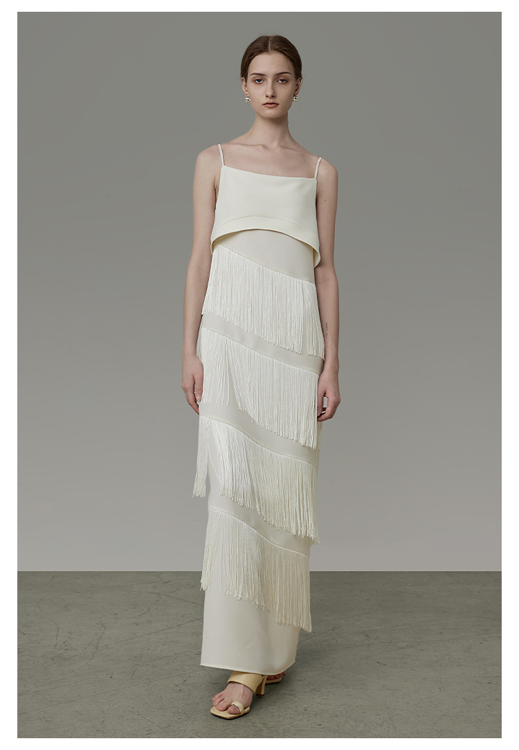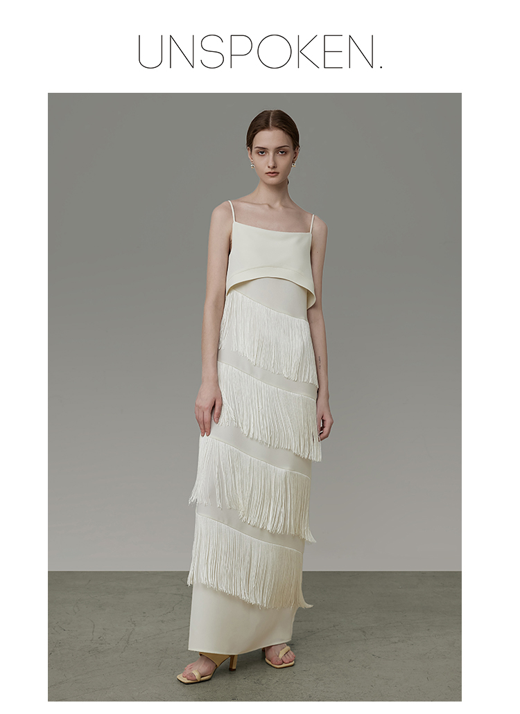 UNSPOKEN白色流蘇開叉連衣裙女設計感小眾法式吊帶裙高級感長裙子