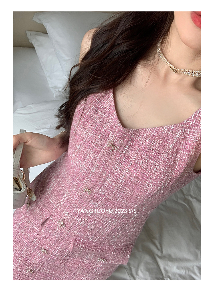 后背同色系隱形拉鏈,一排的蝴蝶結金扣是這件衣服的點睛之筆