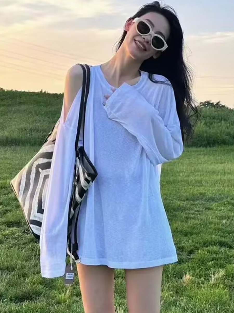 長袖T恤女夏2023新款寬松慵懶冰絲純色露肩薄款防曬圓領罩衫上衣
