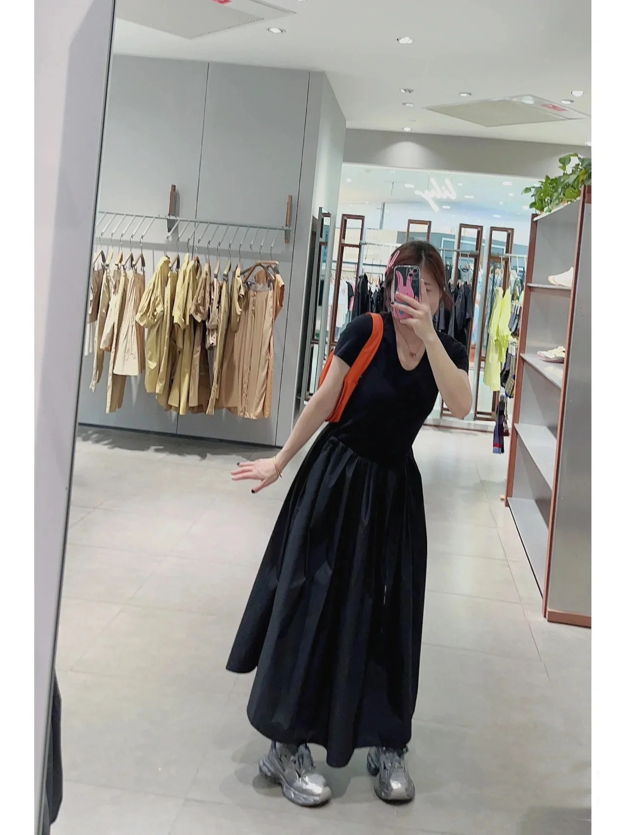 她池簡約連衣裙2023夏裝新款女裝圓領拼接抽褶遮肉顯瘦休閑中長裙