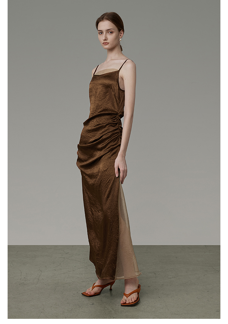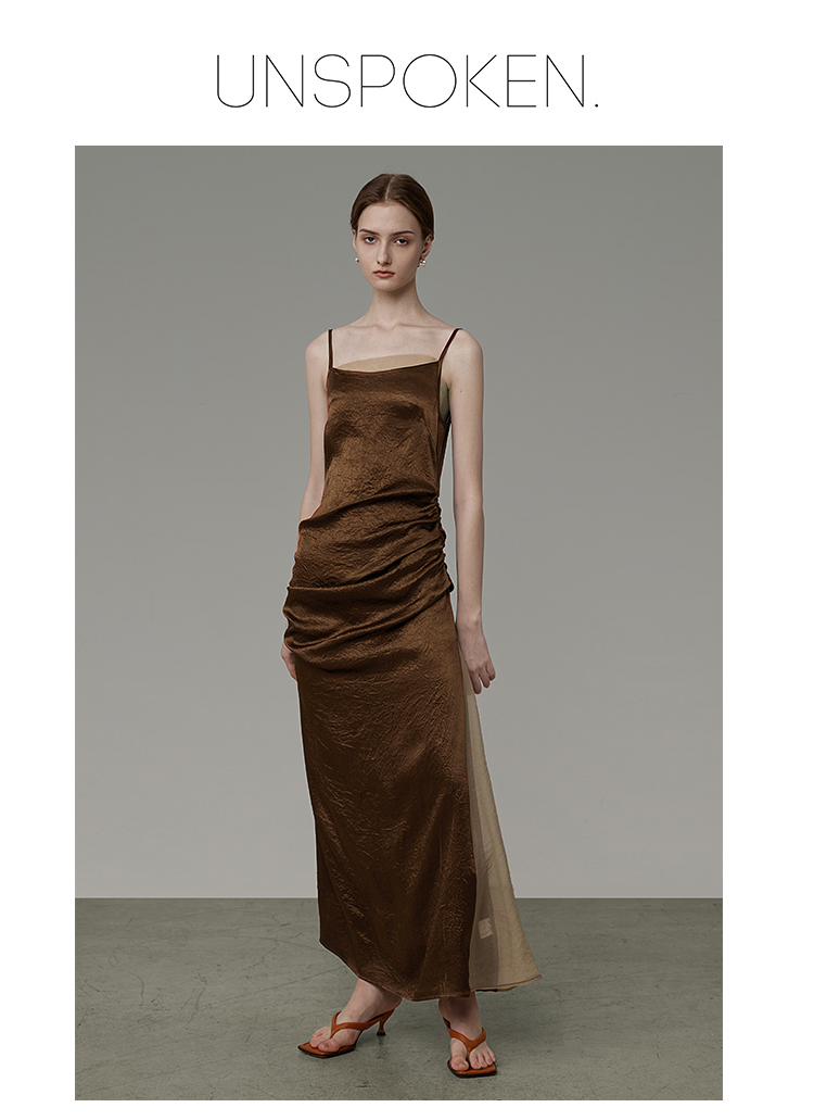UNSPOKEN弧形花瓣設計小眾高級感抽繩褶皺連衣裙2023夏季吊帶長裙
