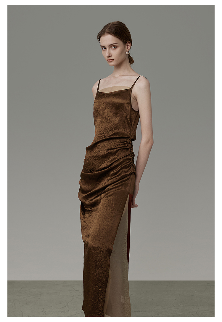 UNSPOKEN扭結褶皺設計氣質修身針織吊帶小眾開叉連衣裙高級感長裙
