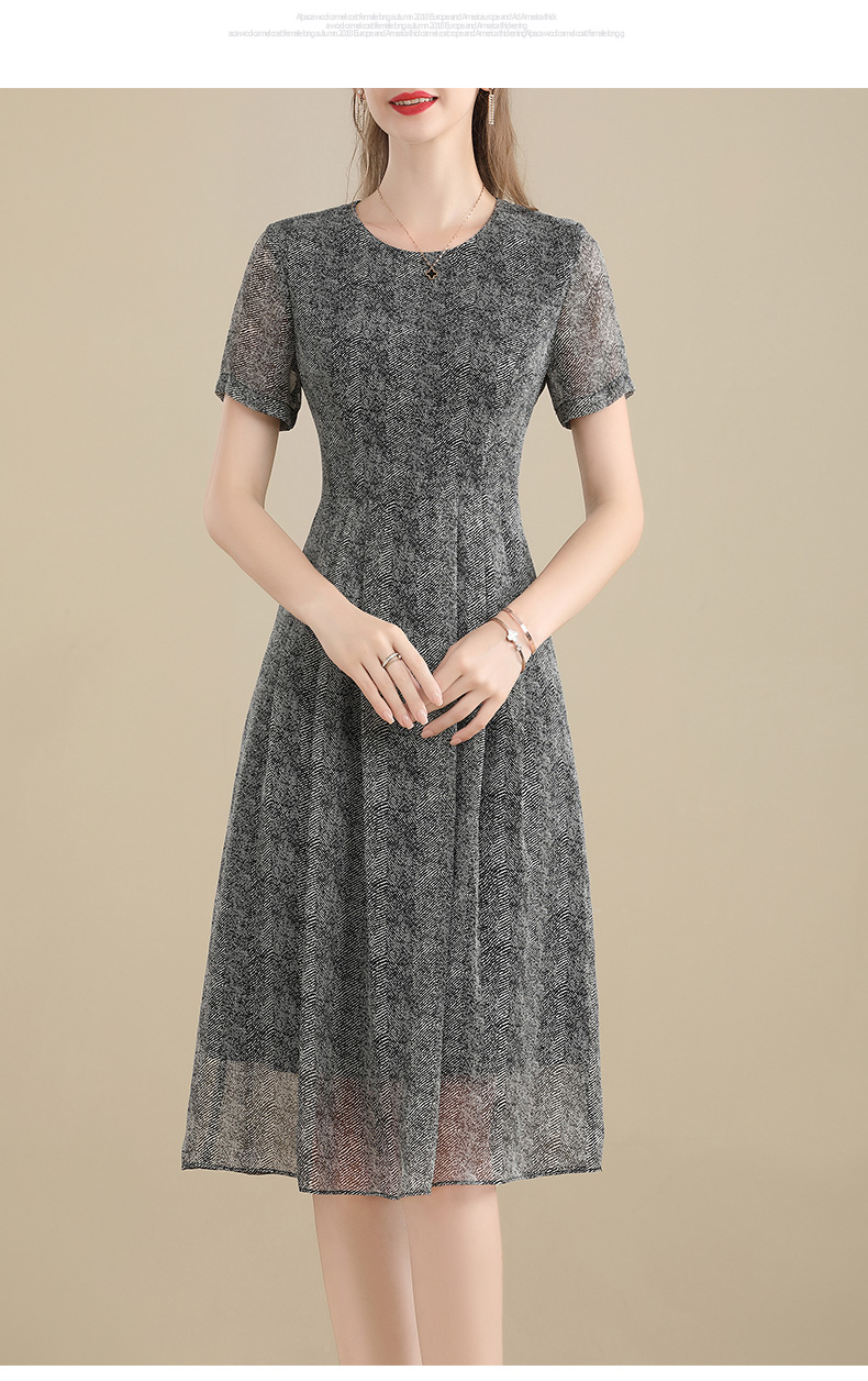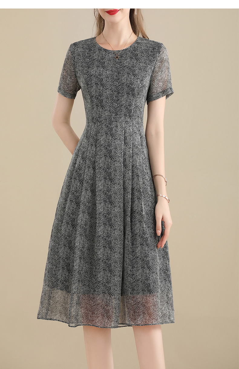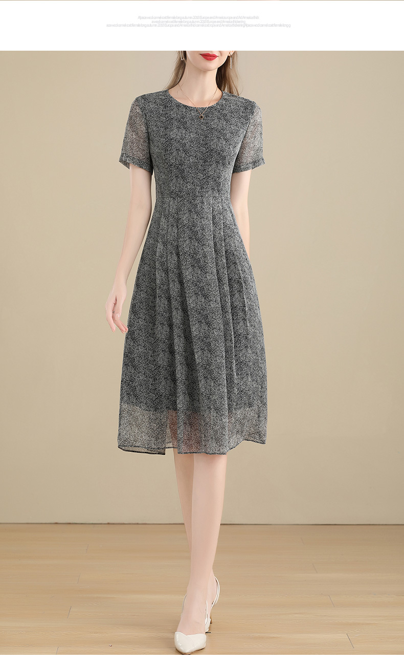 水墨青華2023夏季新款百搭顯瘦印花裙時尚中長款短袖雪紡連衣裙女