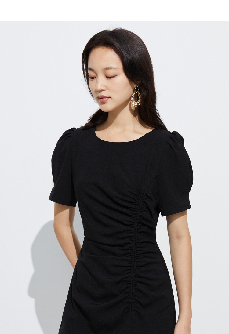 ROCOCO2023秋新款優雅抽褶小禮裙復古赫本風小黑裙微泡泡袖連衣裙