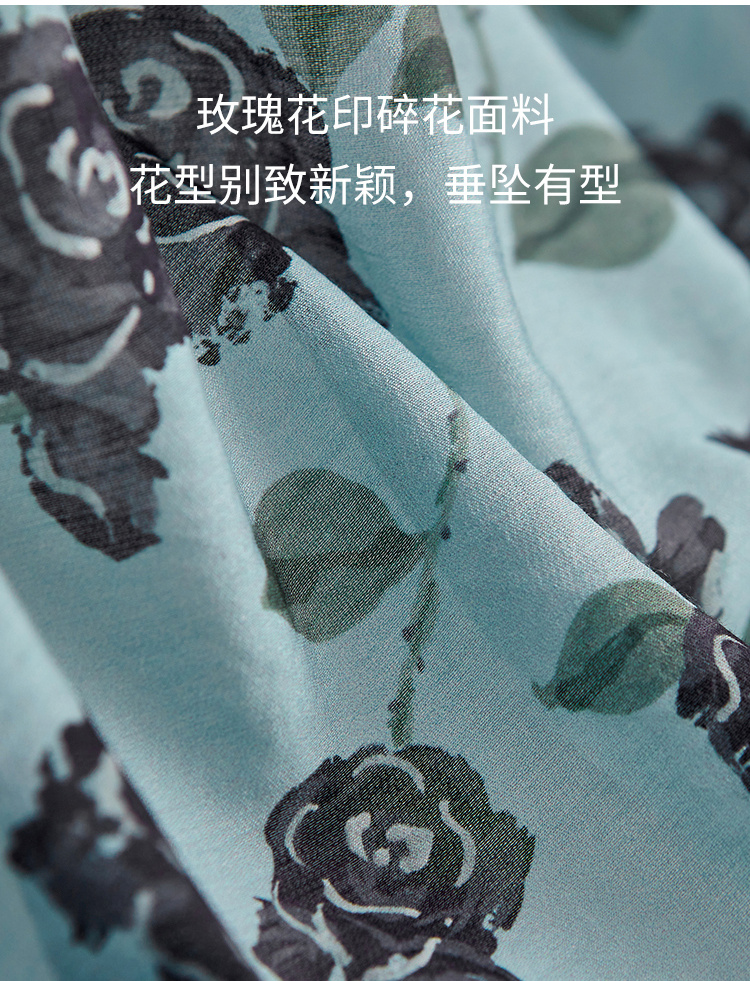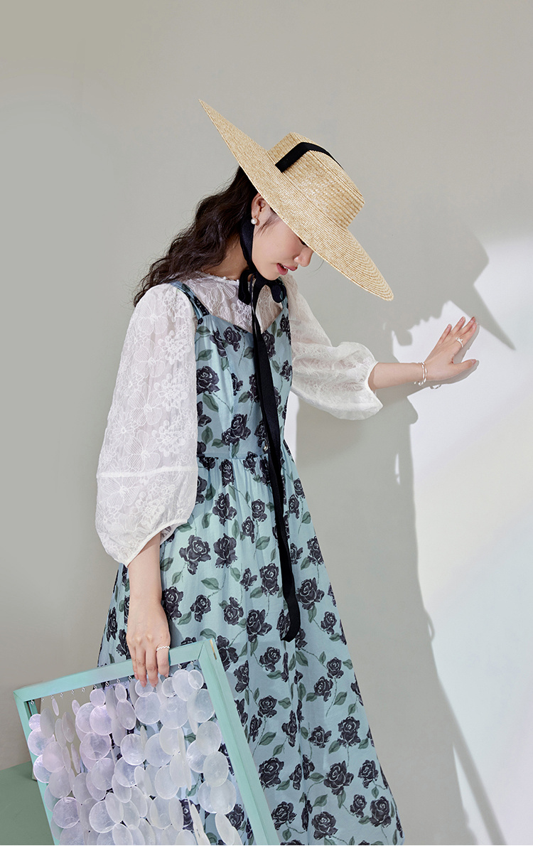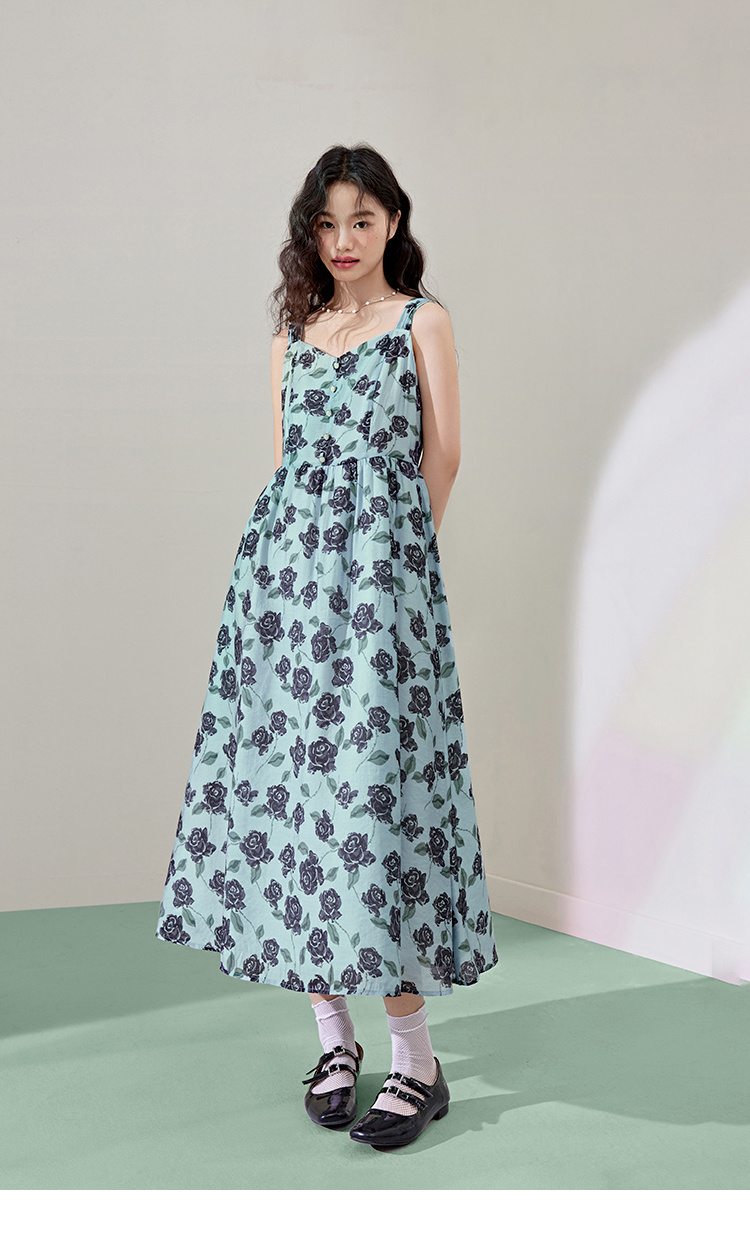 闊色v領吊帶玫瑰連衣裙女2023夏季新款無袖收腰顯瘦氣質長裙子