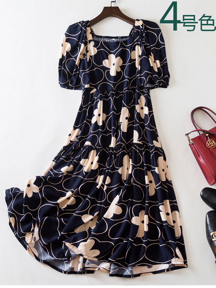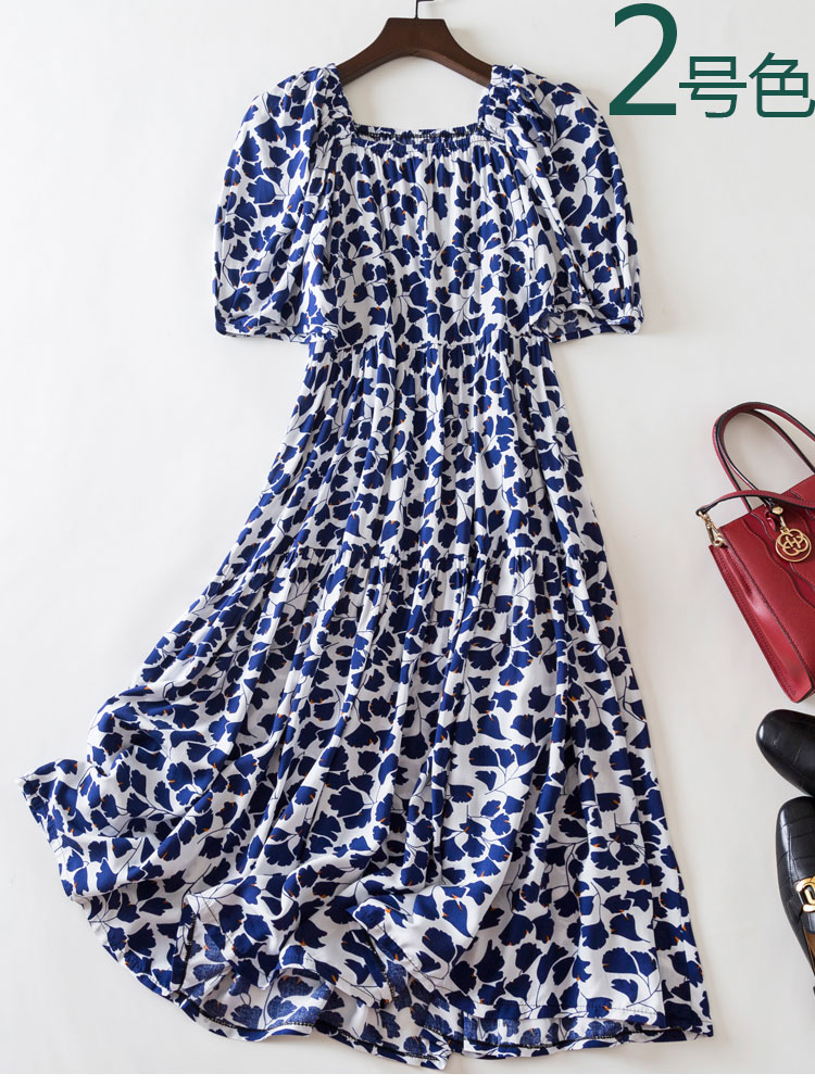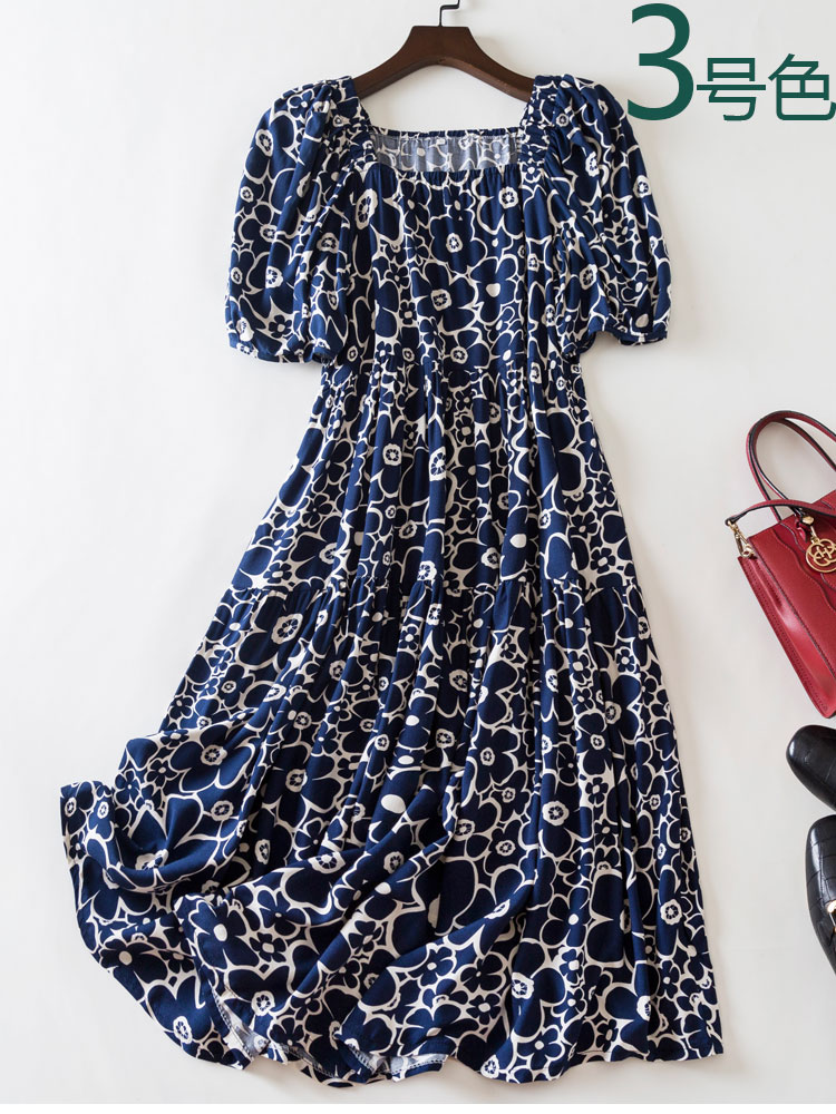 夏季棉綢連衣裙短袖收腰顯瘦綿綢大擺裙中長款碎花裙人造棉沙灘裙