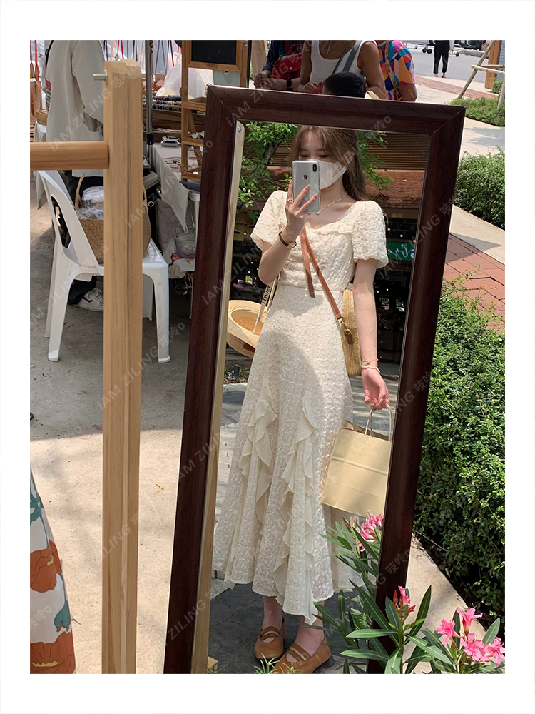 芝士兔自制 連衣裙女夏季法式方領高級感收腰A字裙洋氣顯瘦長裙子