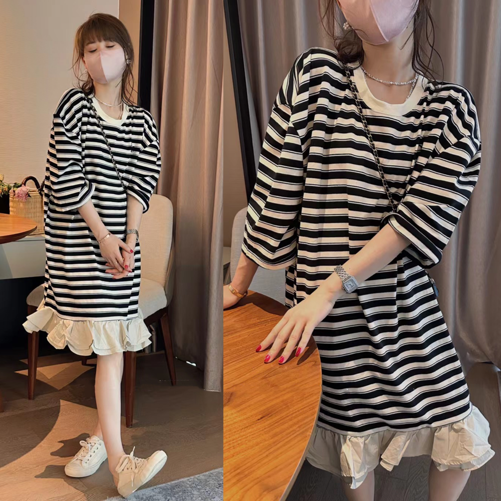 歐洲站2023夏季韓版百搭荷葉邊拼接寬松A字版條紋拼色短袖連衣裙