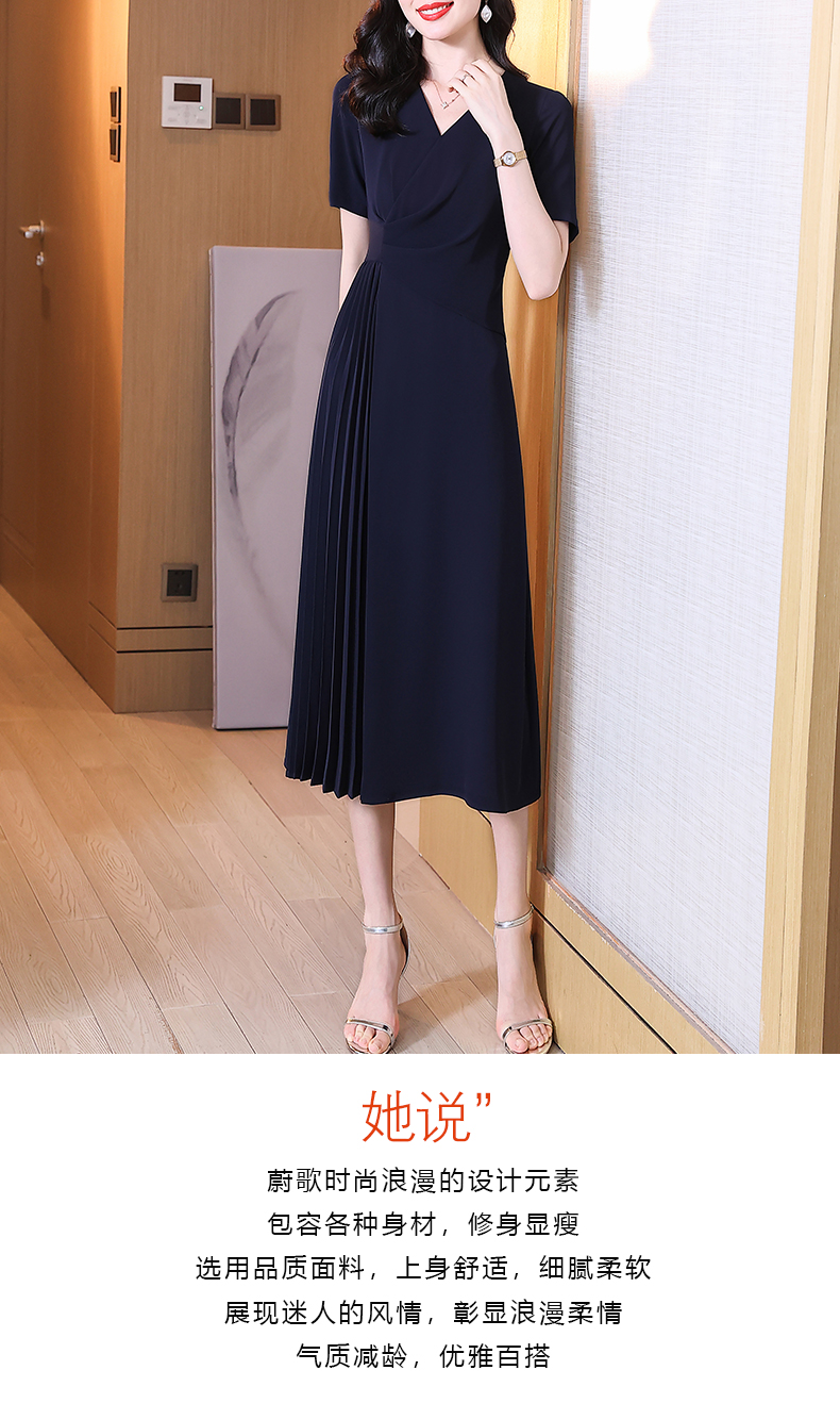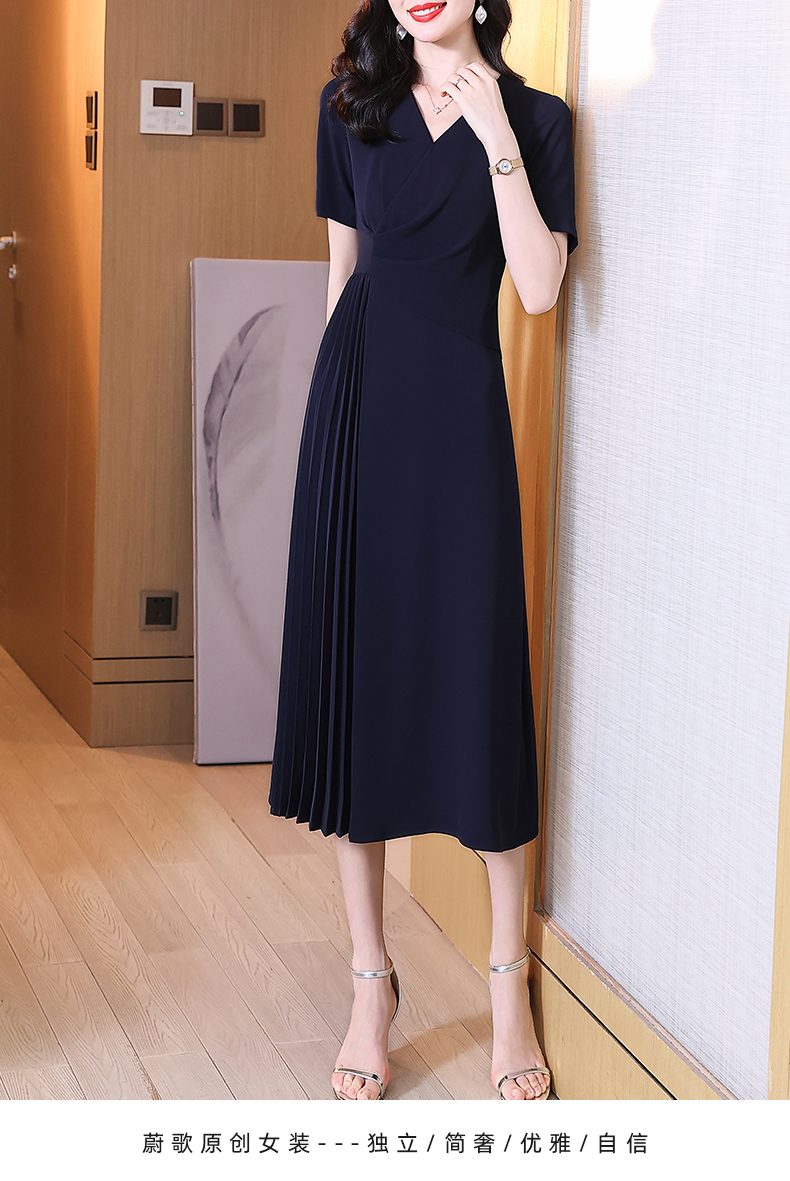 藏青色百褶連衣裙女2023夏季新款短袖A字氣質收腰顯瘦減齡長裙子
