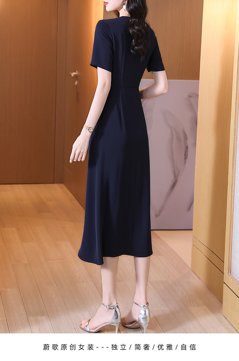藏藍色連衣裙夏季2023新款收腰顯瘦長款氣質大擺裙高級感淑女長裙