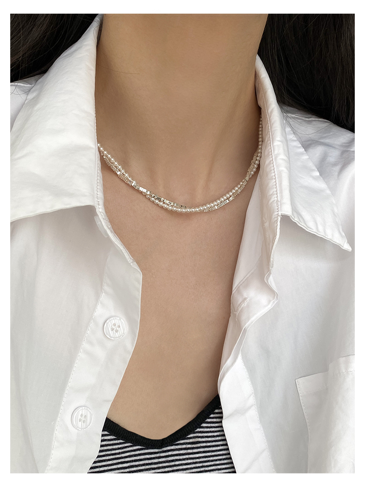 DOUDOUSTORE保色雙層纏繞碎銀子珍珠項鏈百搭重工頸鏈鎖骨鏈