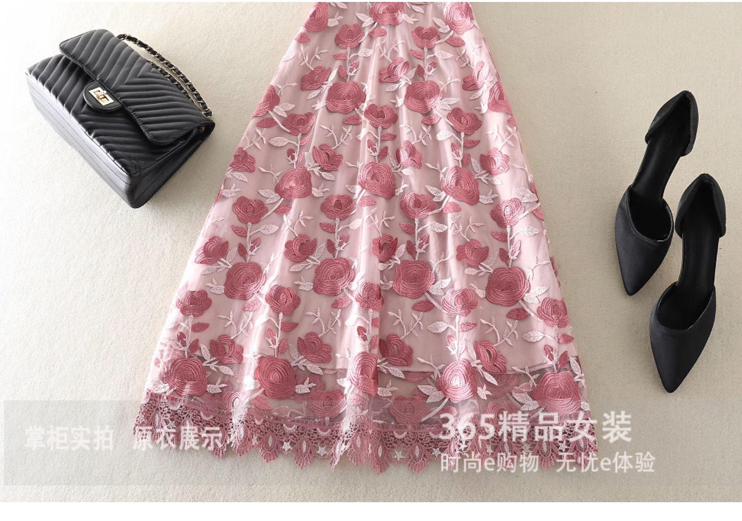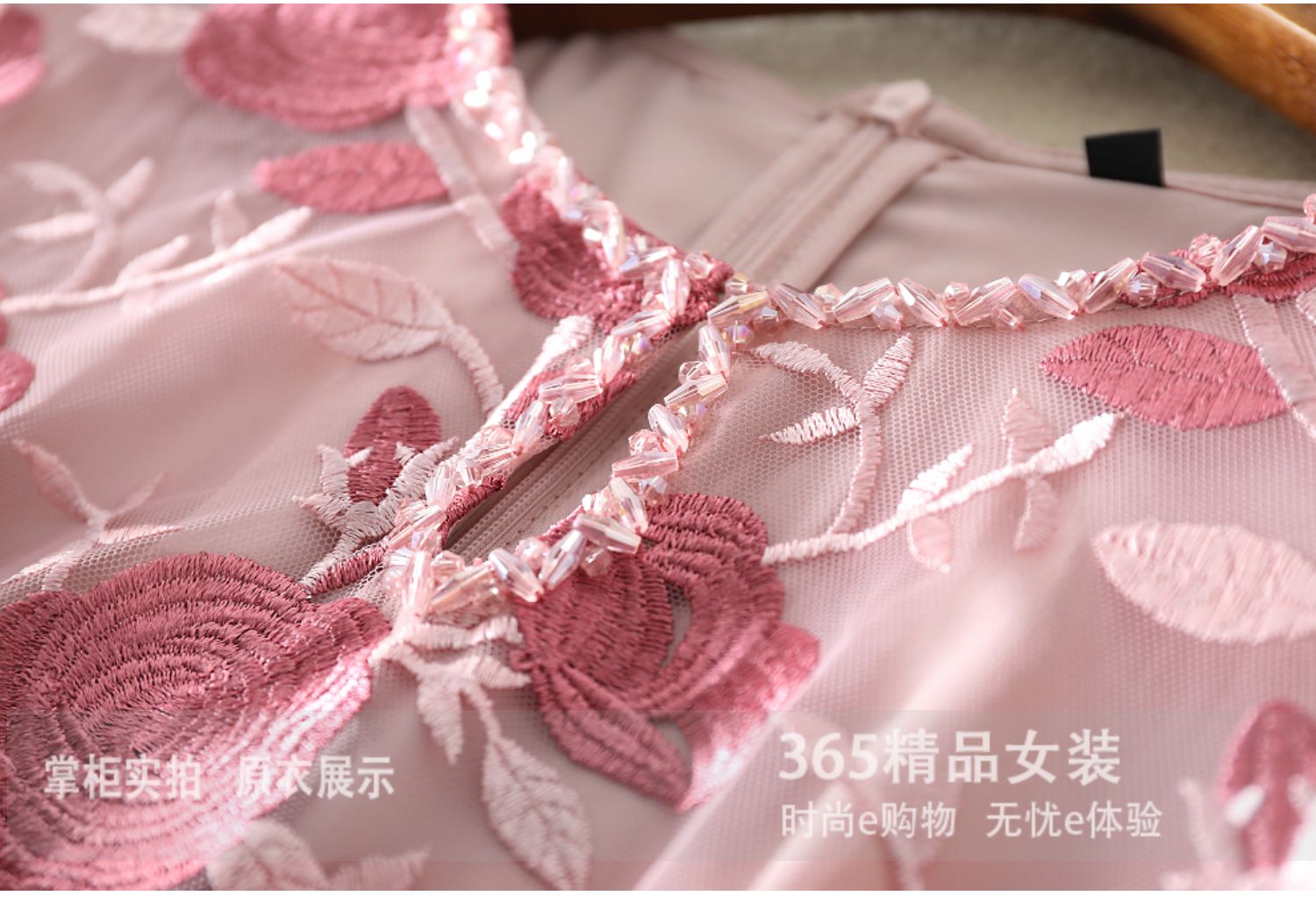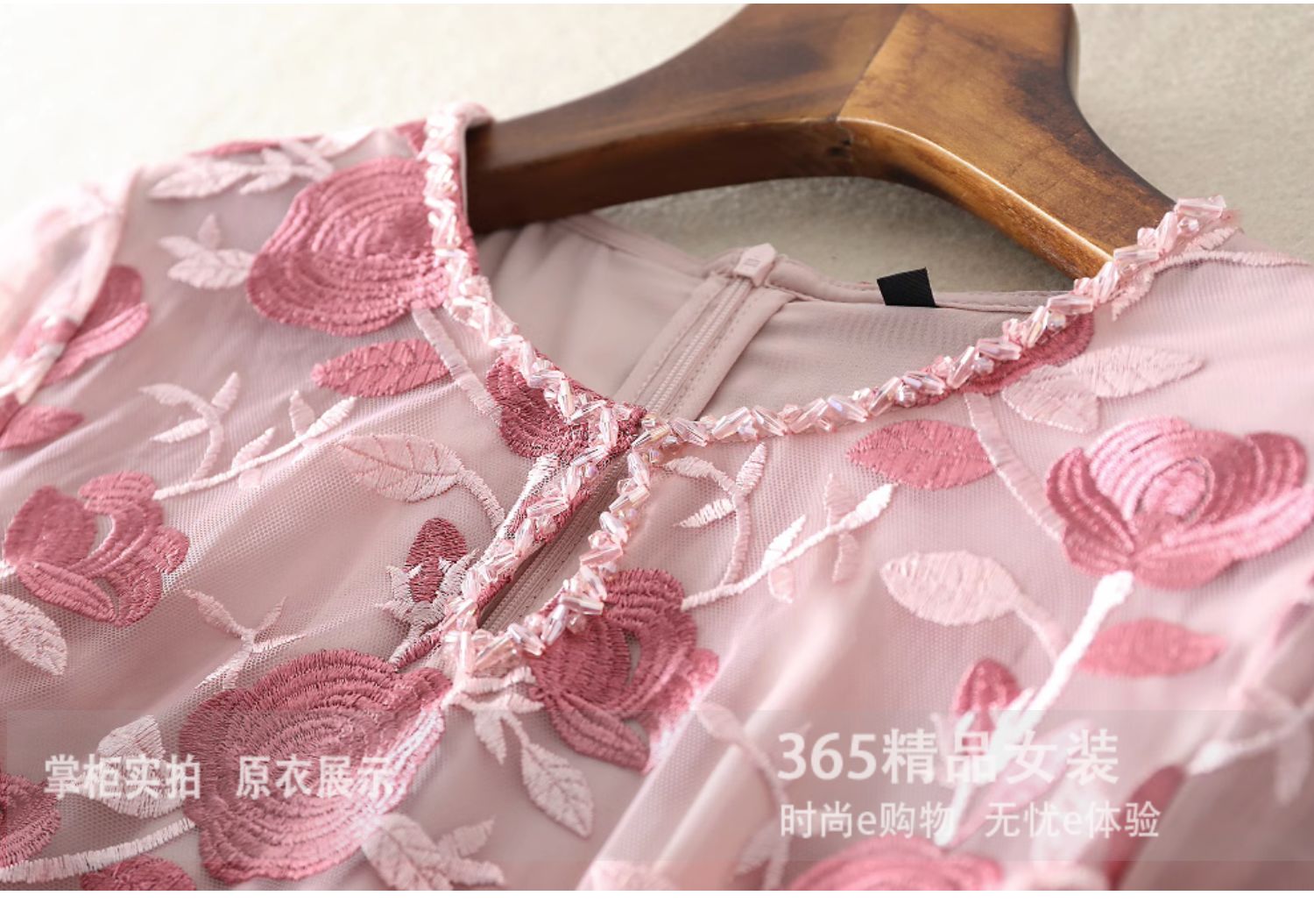 大牌氣質粉色剌繡連衣裙女2023夏新款中年女士媽媽裝顯瘦禮服裙子