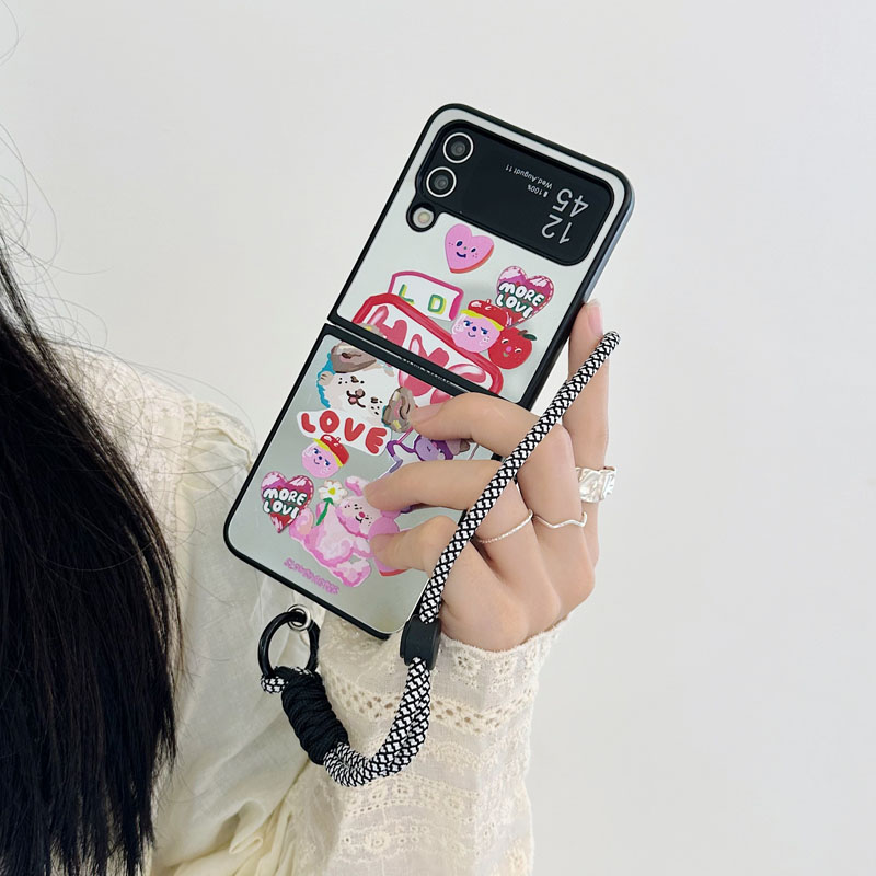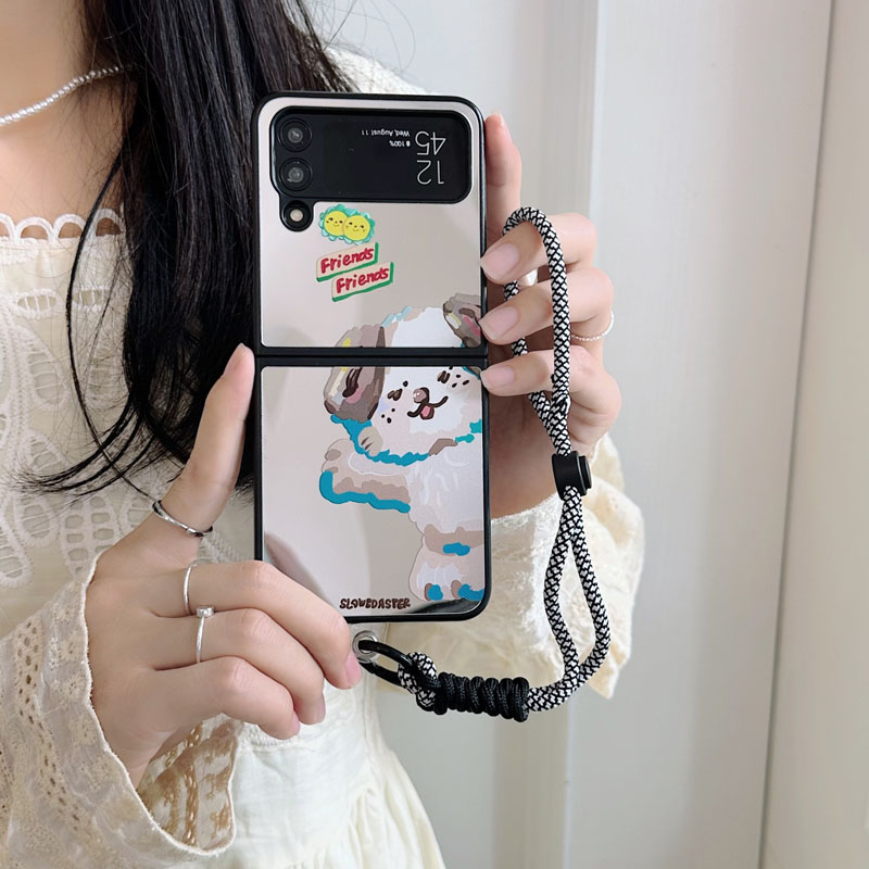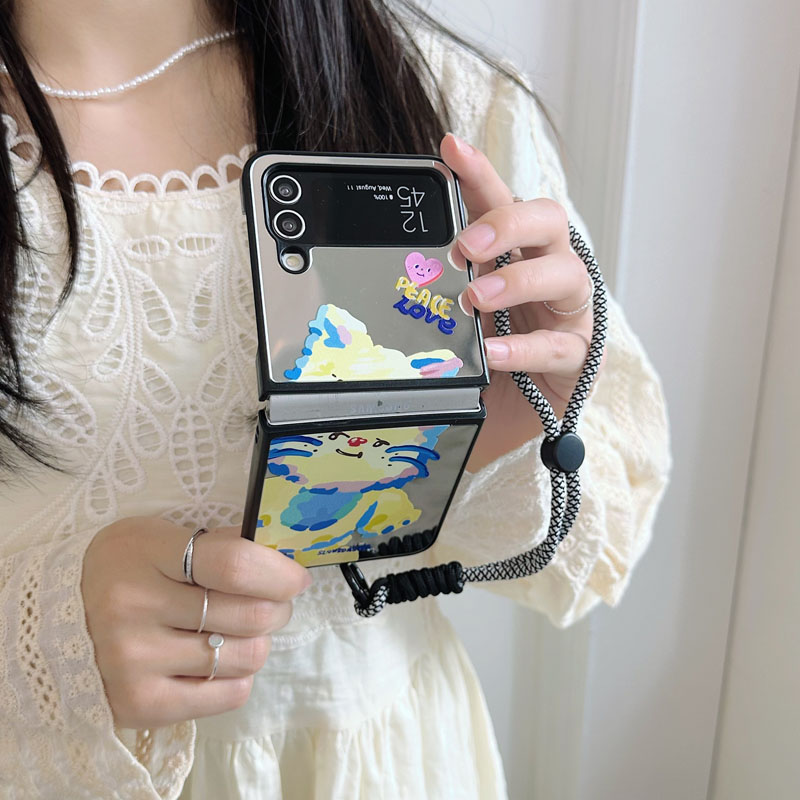 適用三星zflip5手機殼INS韓風涂鴉貓狗化妝鏡子保護套新zflip 3殼折疊屏鏡面短手鏈提繩flip4硬殼三4女網紅3