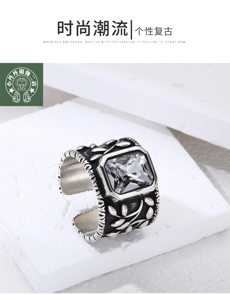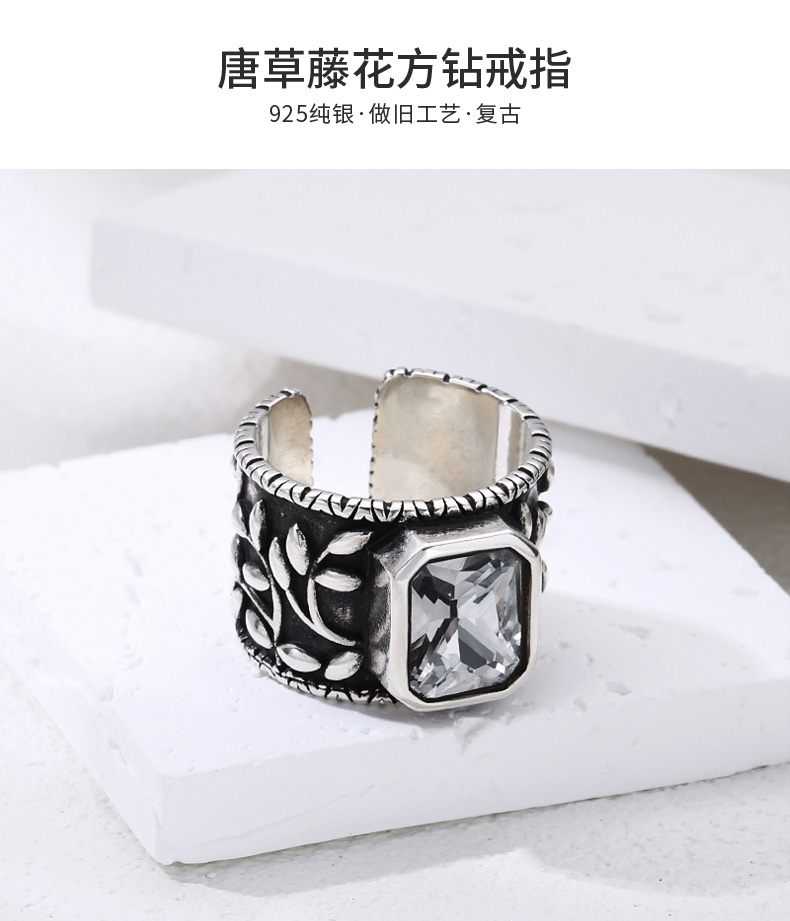 純銀復古做舊藤花唐草方鉆戒指個性女生食指戒指朋克潮牌流行指環