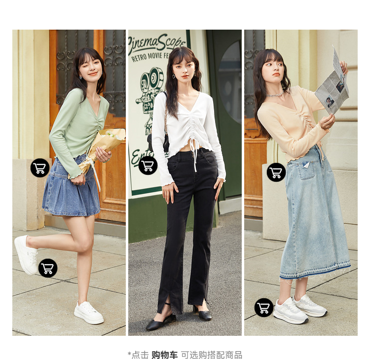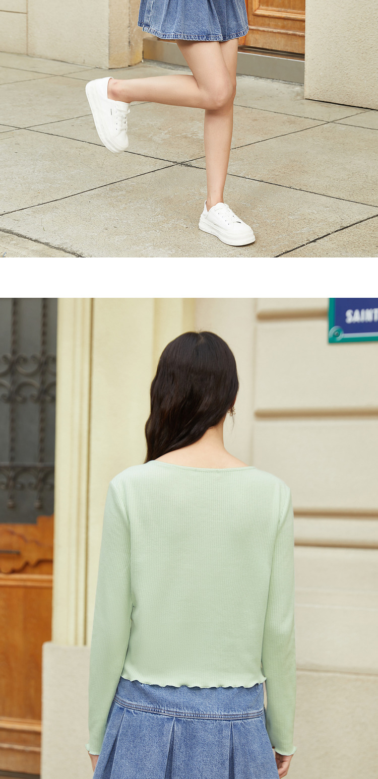 三福長袖T恤2023早秋季新款甜辣抽繩設計感小眾V領木耳邊上衣女裝