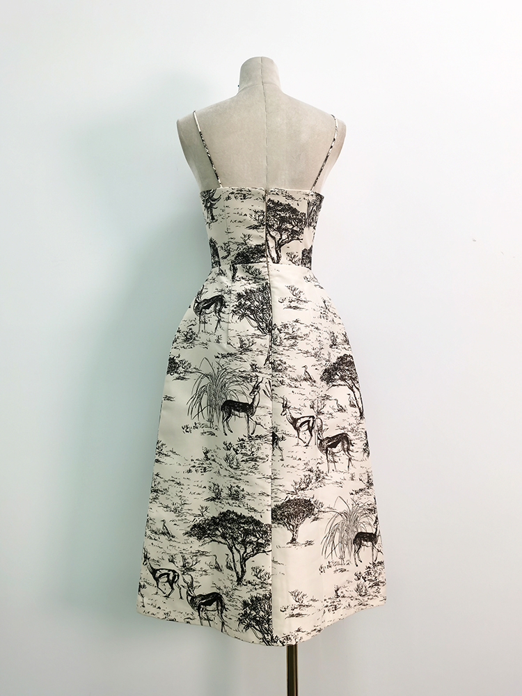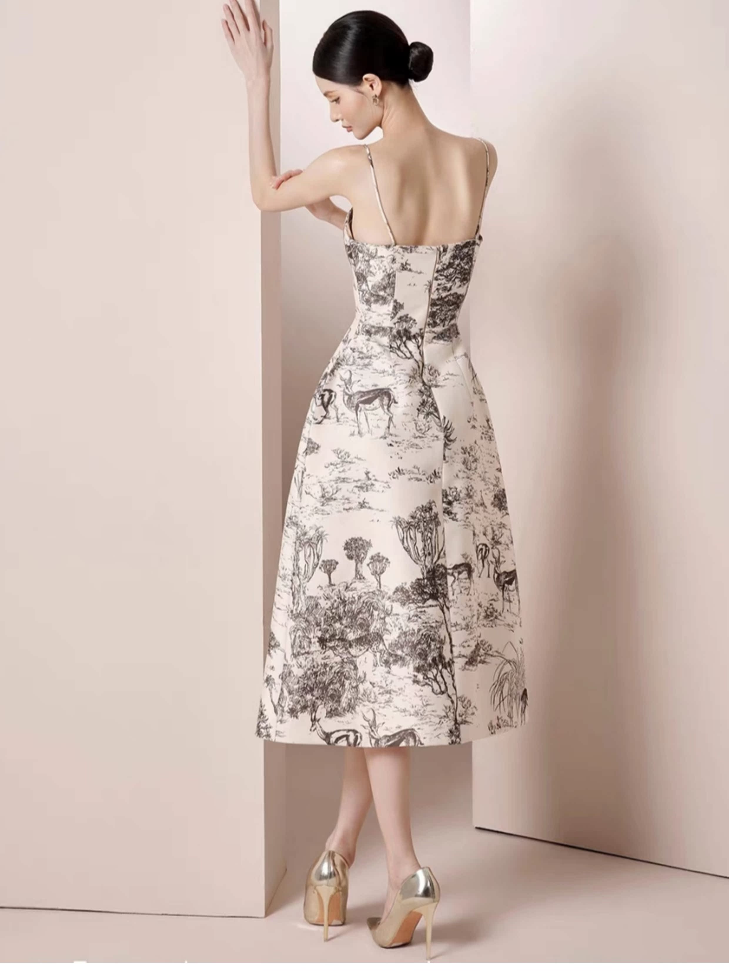 法式復古吊帶連衣裙女越南小眾設計師下擺開叉風景印花顯瘦小禮服