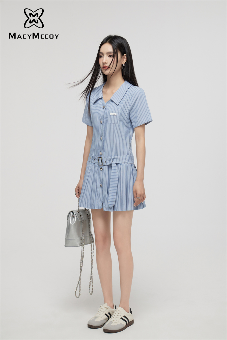 【清貨折L】Macy Mccoy 2023春夏新款系帶條紋襯衫裙百搭高級