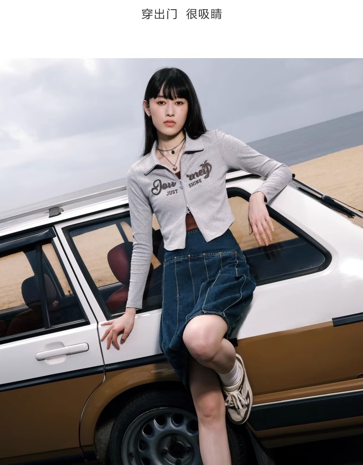 三福長袖T恤2023秋季設計感小眾雙頭拉鏈Polo領修身灰色上衣女裝