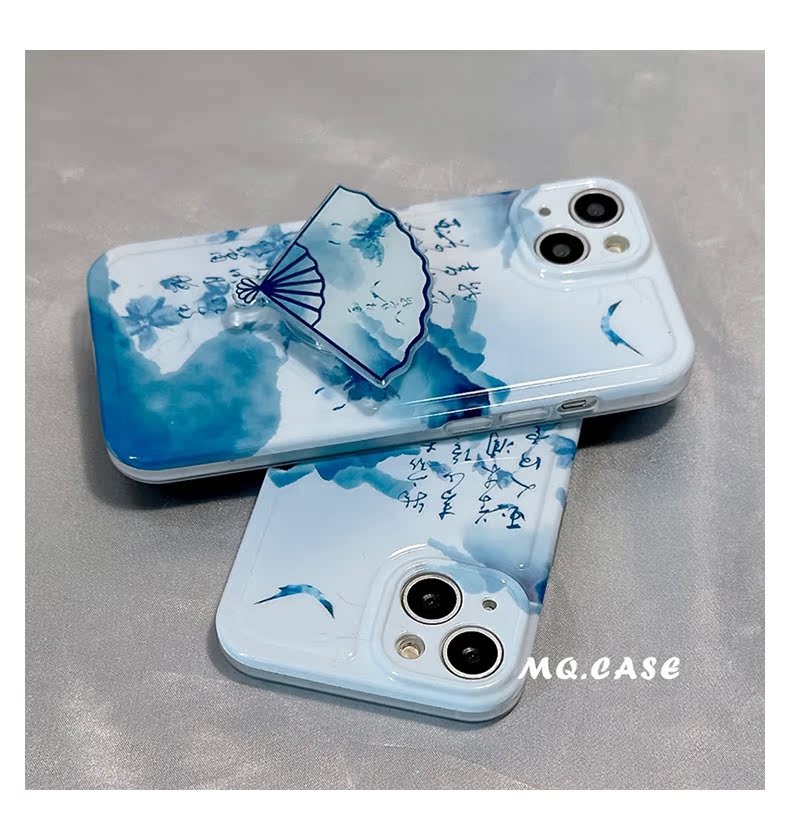 中國風山水風景適用蘋果14手機殼帶扇子支架iPhone13Promax新款14Pro保護套12硅膠防摔11全包軟殼男女復古潮