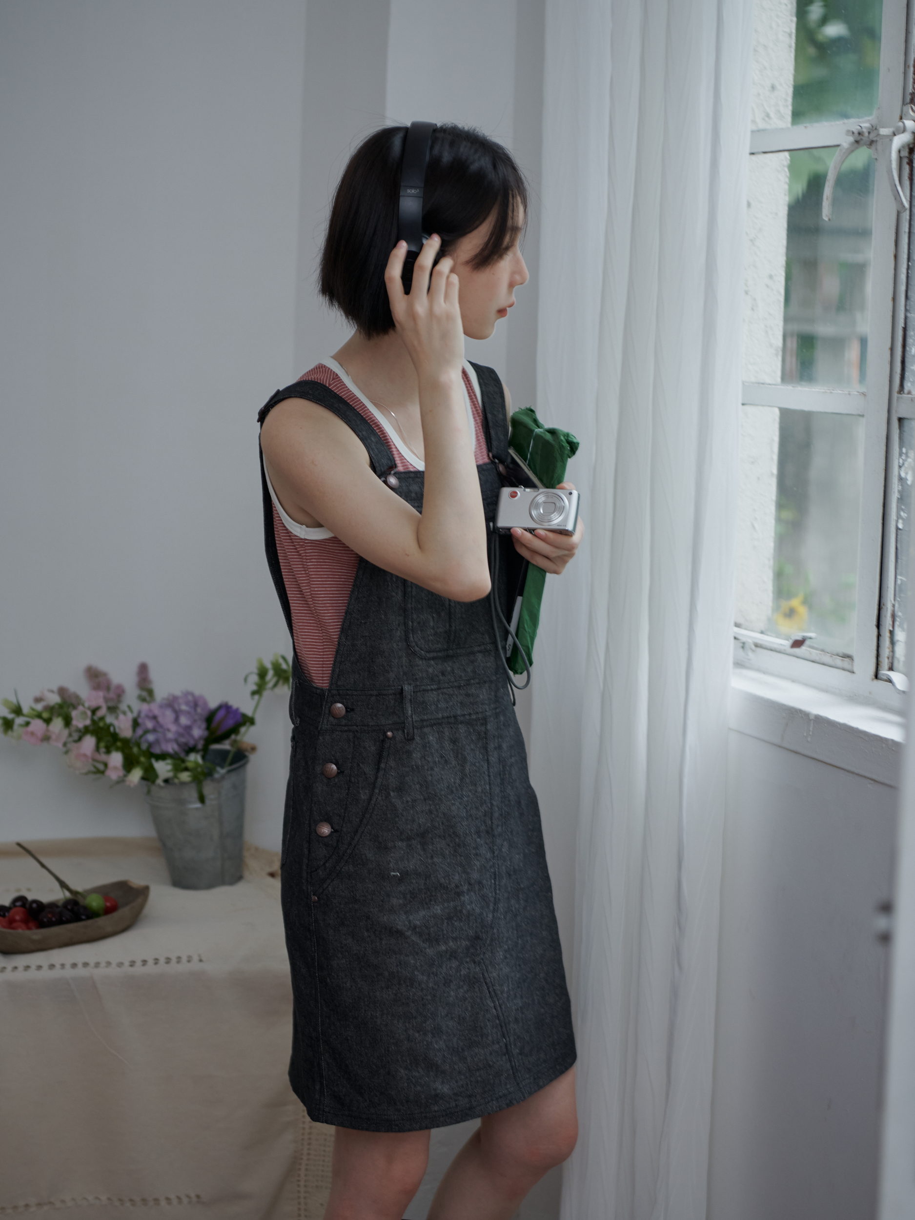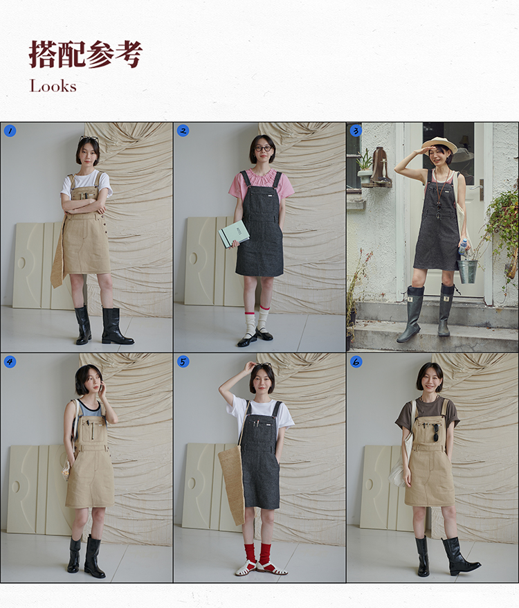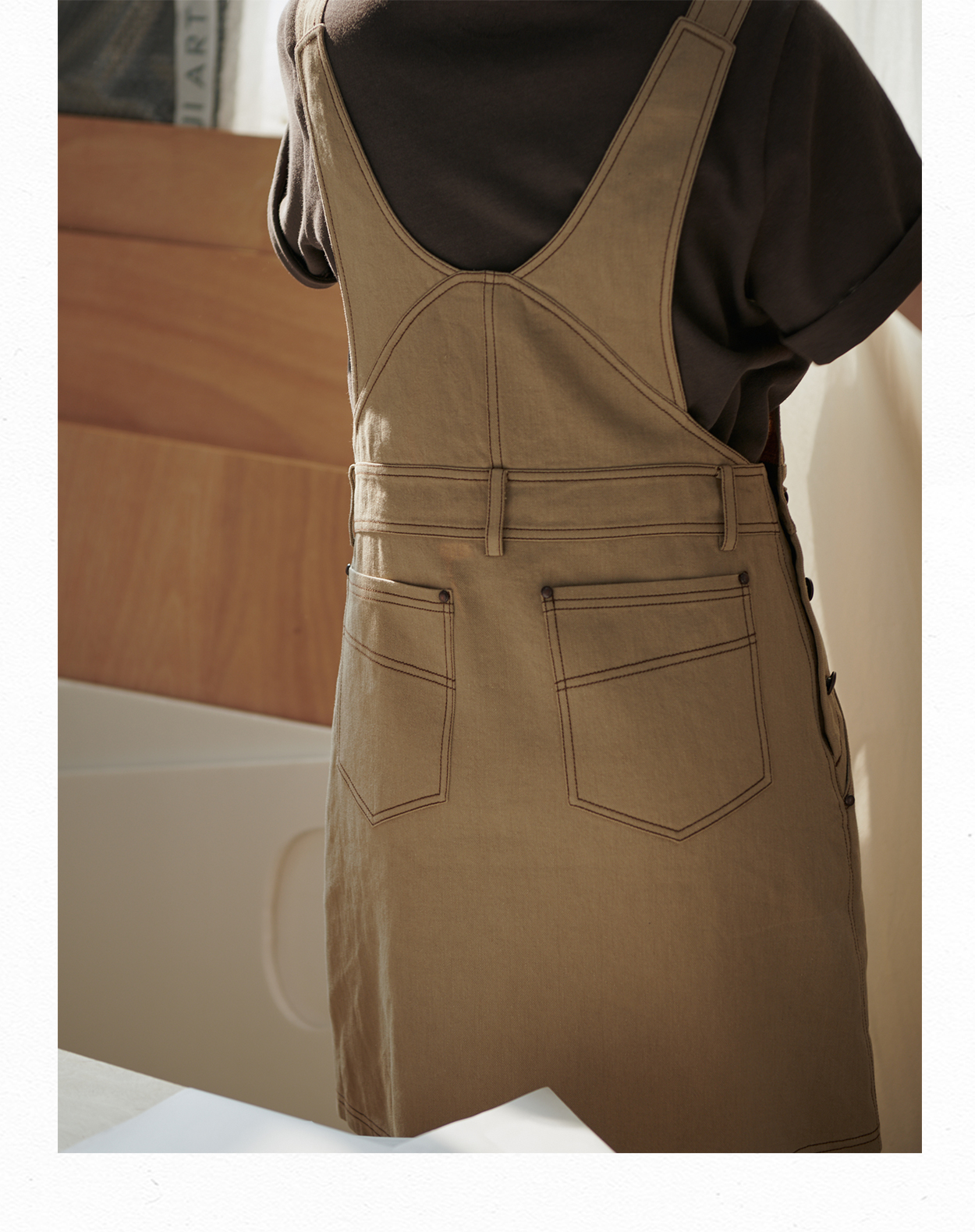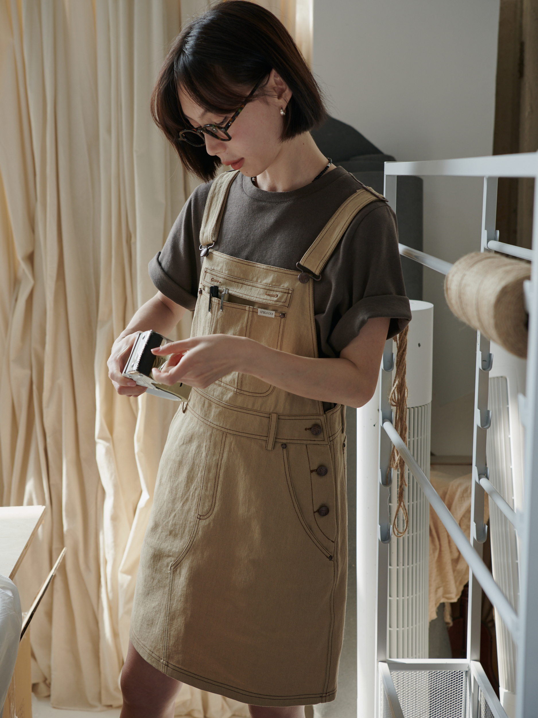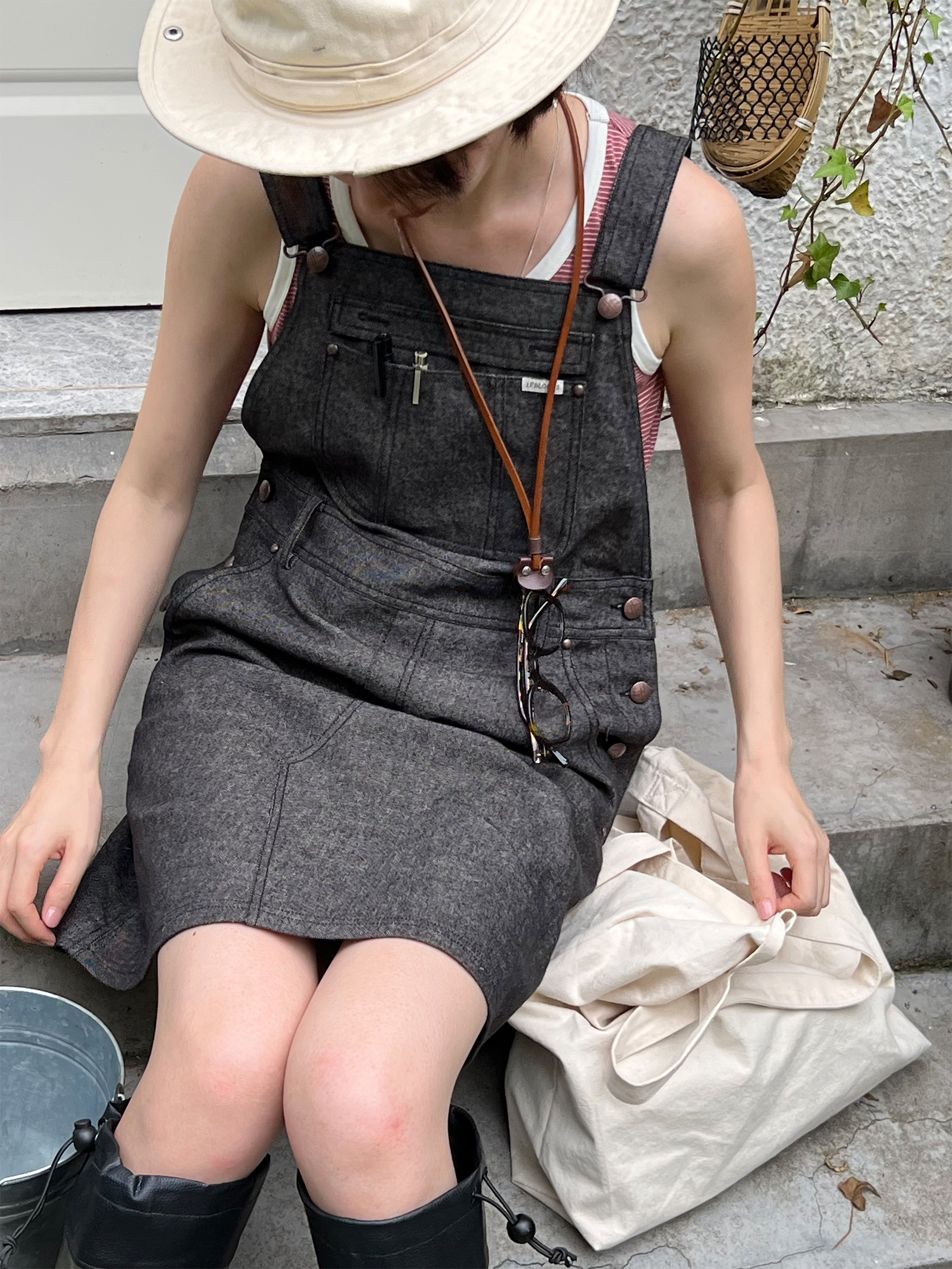 一方二集 美式復古元氣工裝亞麻棉色織牛仔背帶短裙