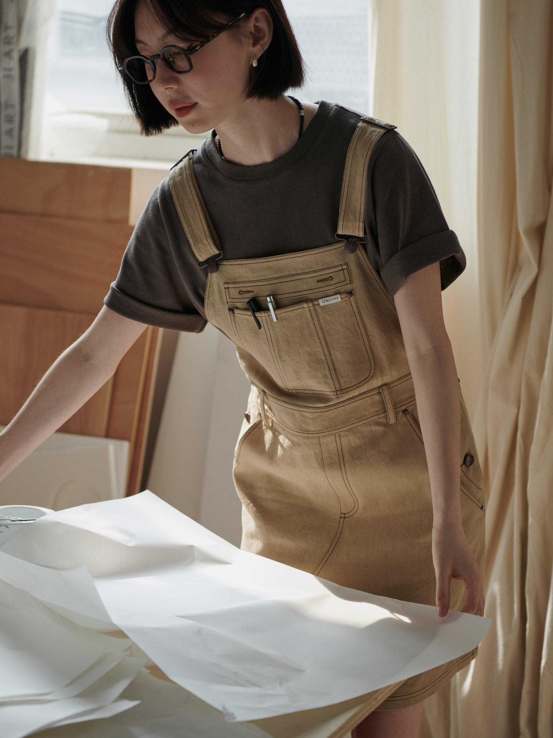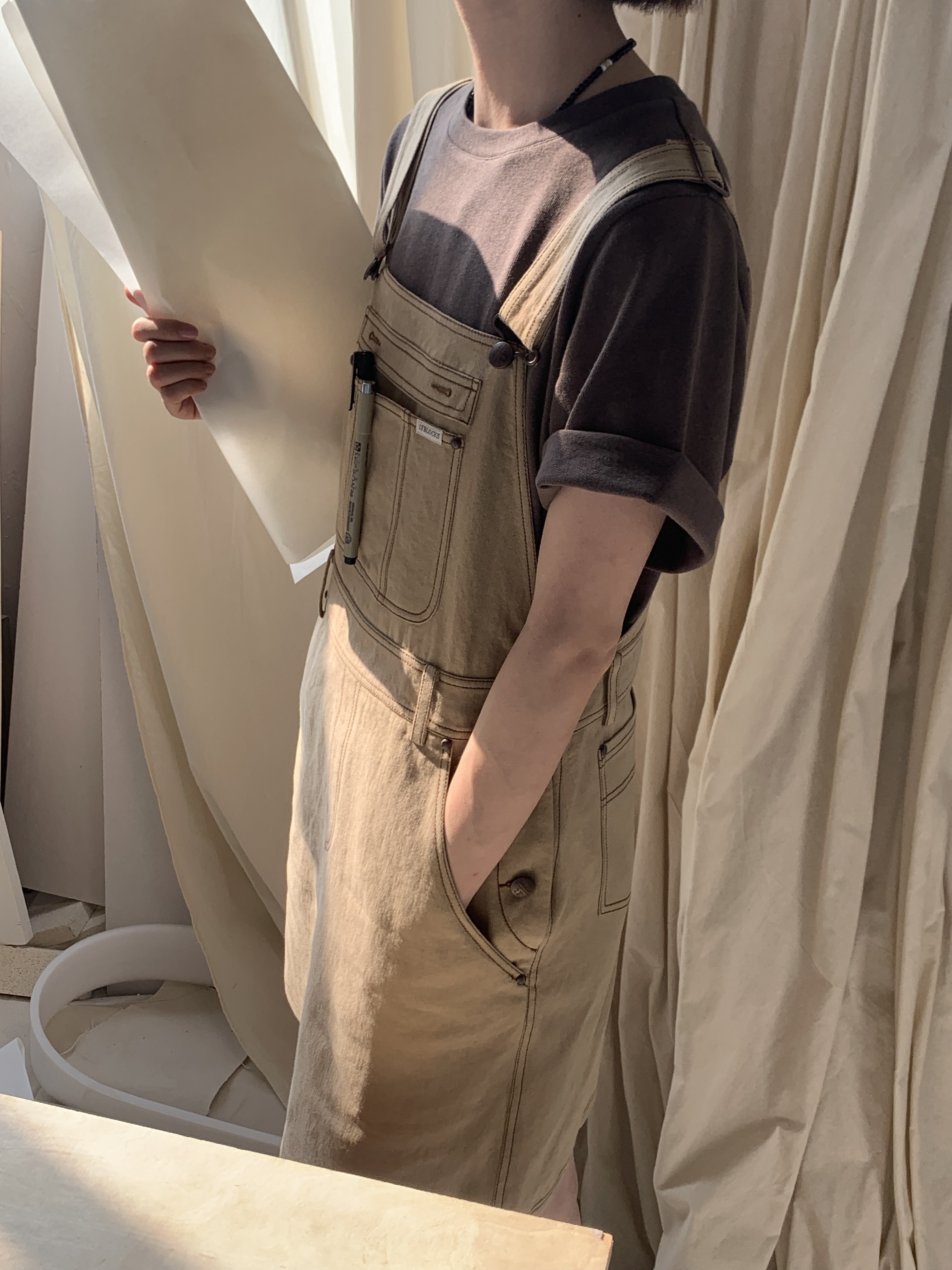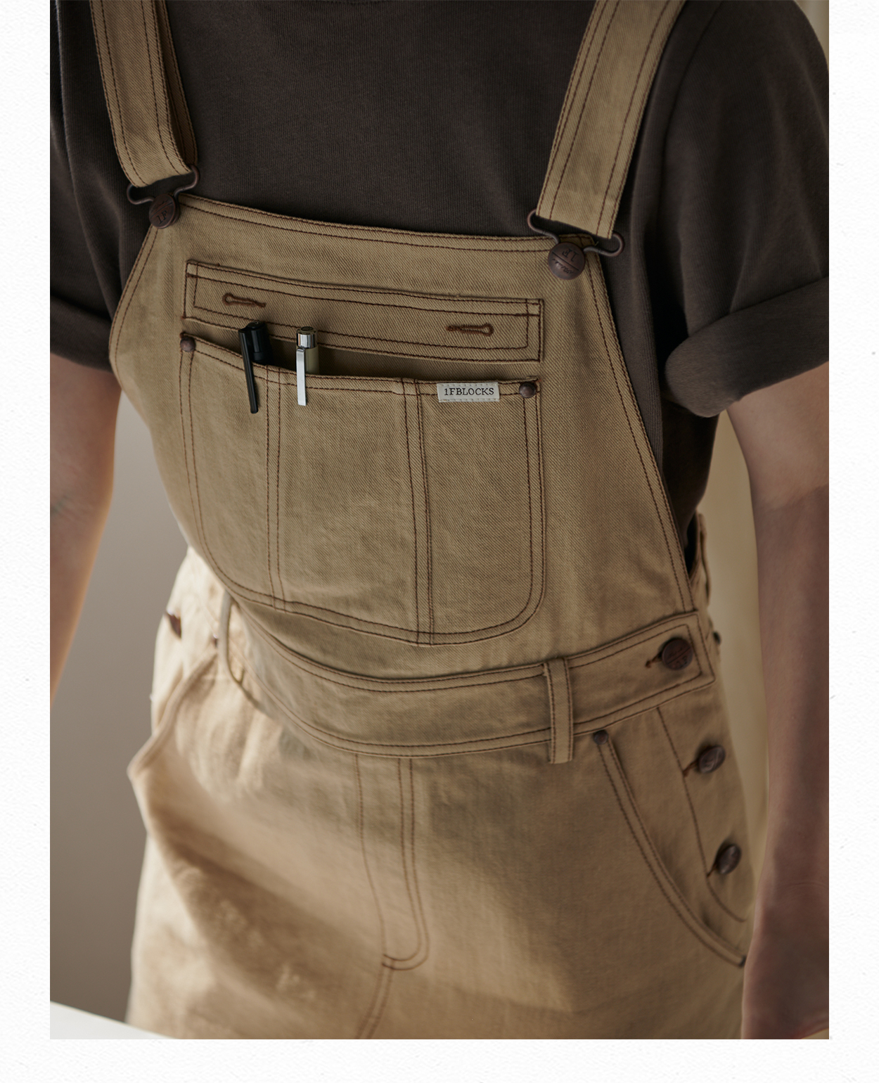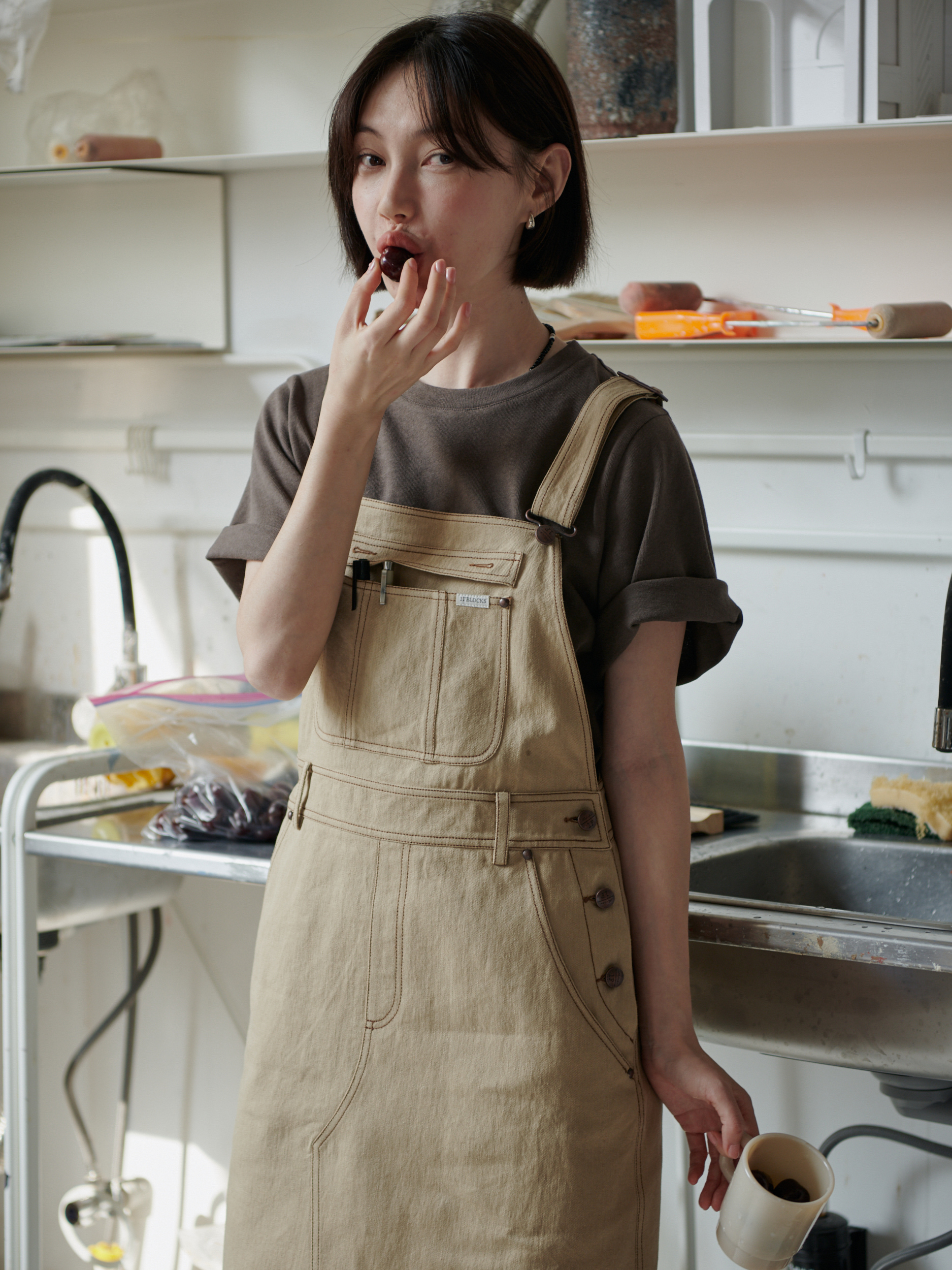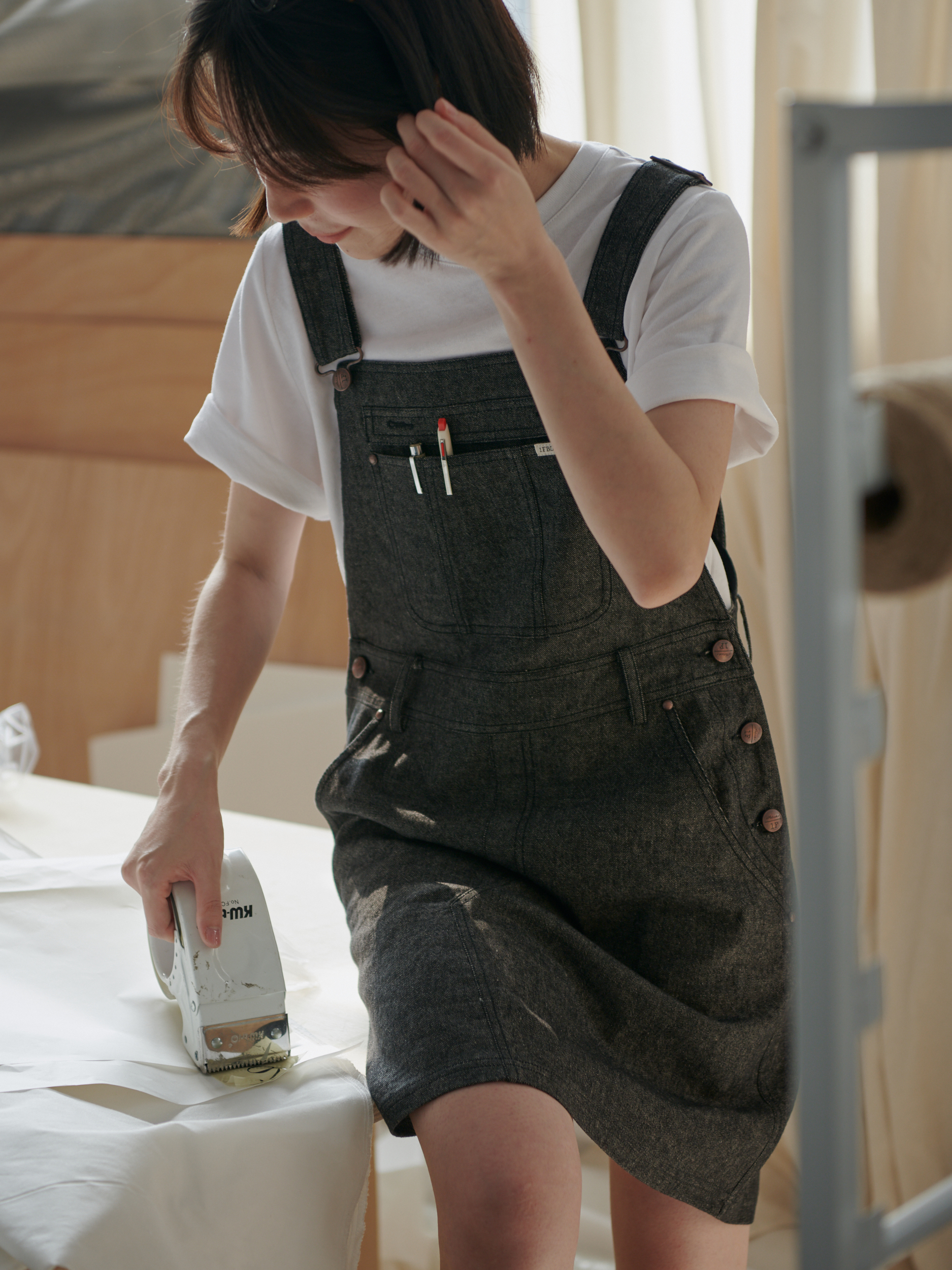 一方二集 美式復古元氣工裝亞麻棉色織牛仔背帶短裙