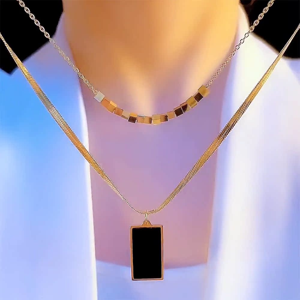 鈦鋼高貴個性項鏈雙層疊戴轉運鎖骨鏈女百搭黑方塊吊墜時尚不掉色